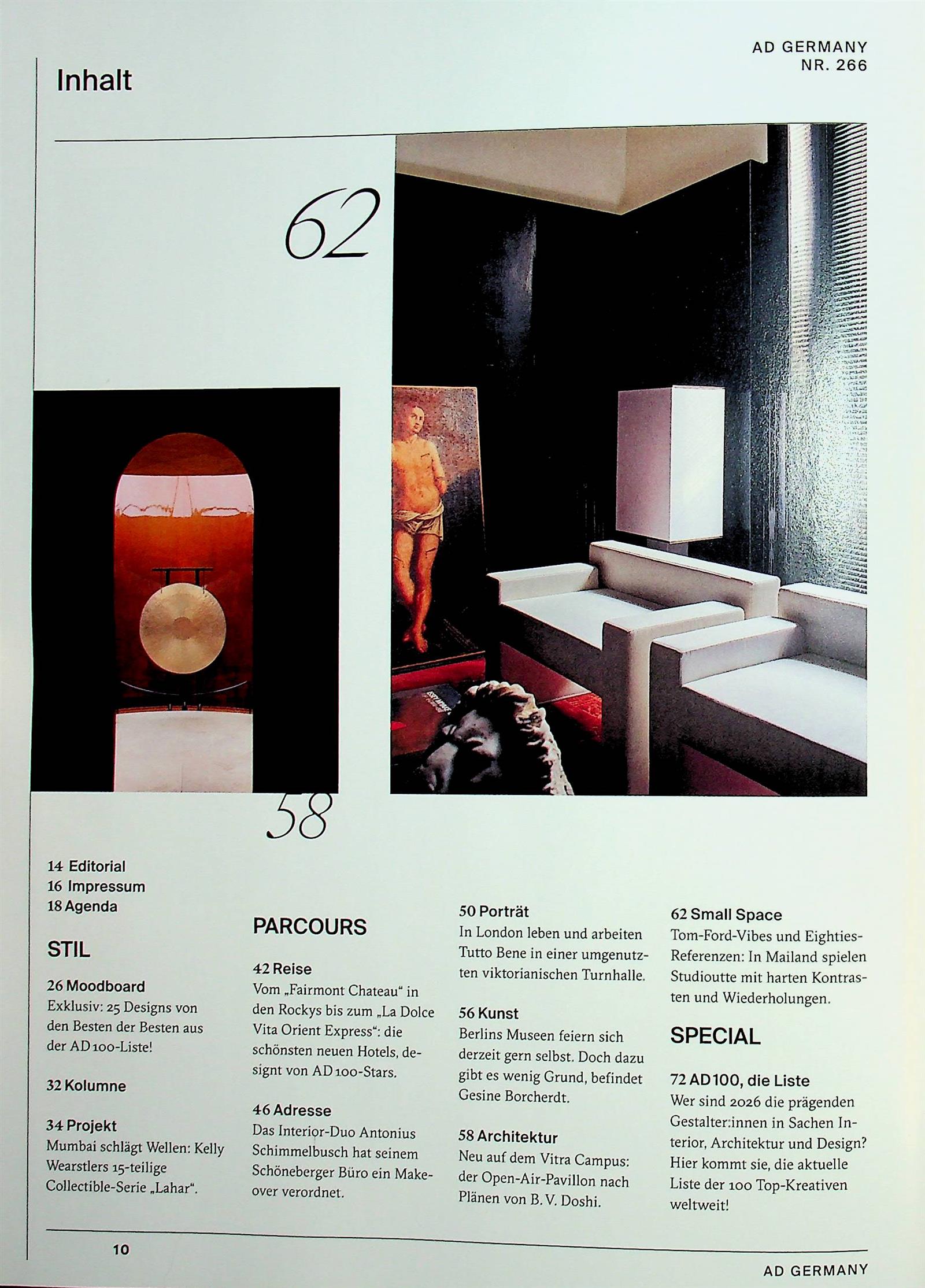 AD Architectural Digest erscheint 10 mal im Jahr in einer Druckauflage von 12.000 zum Thema Architektur, Design und Gestaltung.