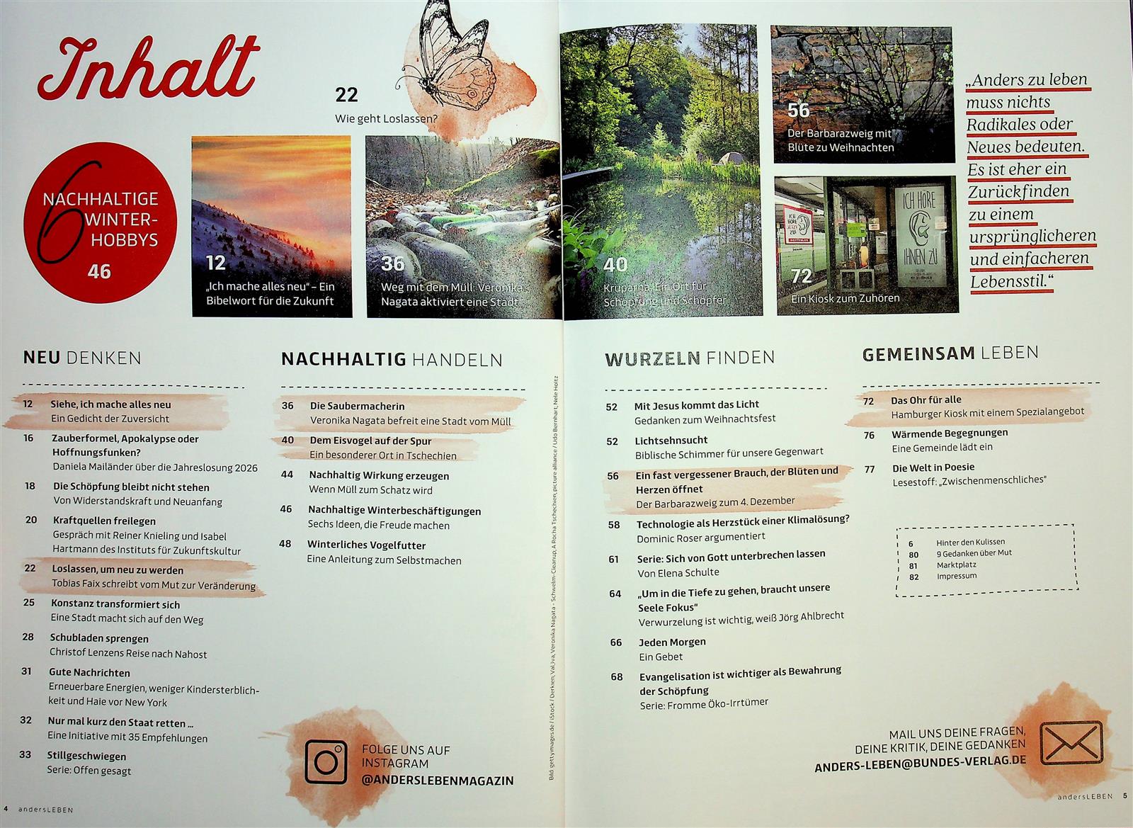 Anders leben sucht nach guten Wegen in eine Zukunft, die nachhaltig, sozial und im christlichen Glauben verwurzelt ist. Im Jahr 2020, getrieben von Corona und der Klimakrise, haben viele Menschen erkannt, dass sich etwas ändern muss. Anders leben ist ein Magazin, das von diesem Gefühl angetrieben wird. Ausgehend von der Idee, dass wir mehr Gemeinschaftssinn, Mitgefühl, Nachhaltigkeit und tiefere Spiritualität für neue nachhaltige Lebenskonzepte brauchen, unterstützt das Magazin dieses gemeinsame Streben und Ringen auf dem Weg zur Gestaltung der Zukunft.