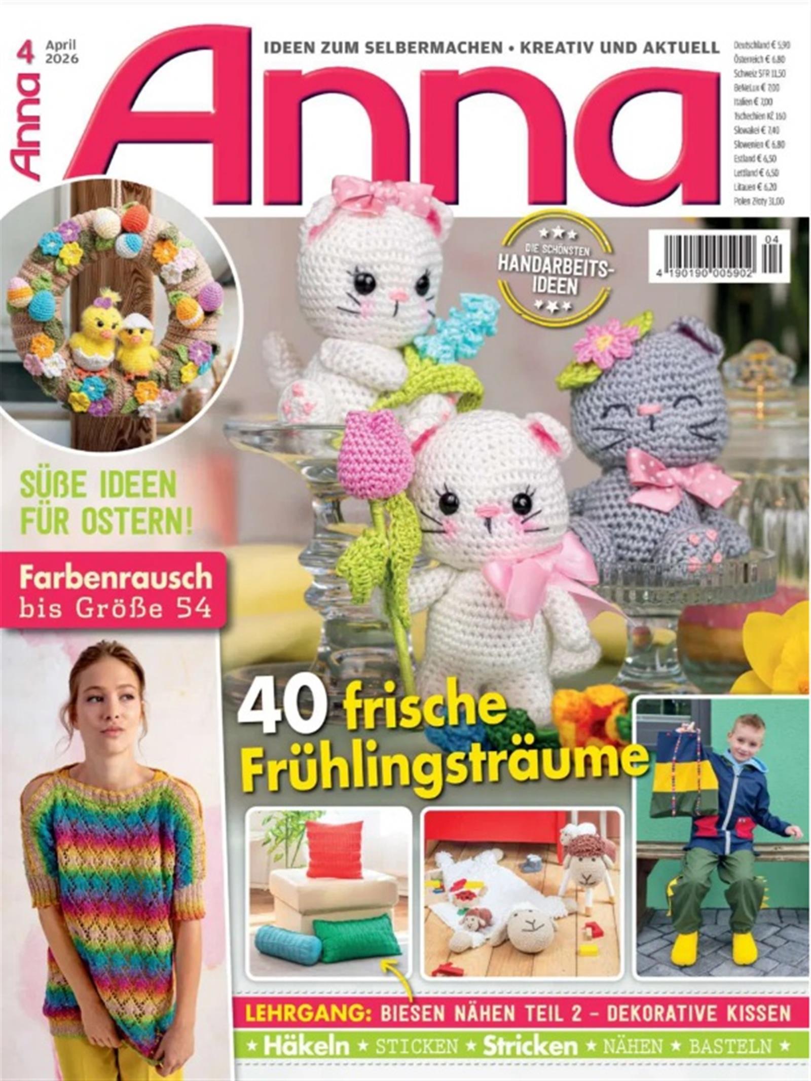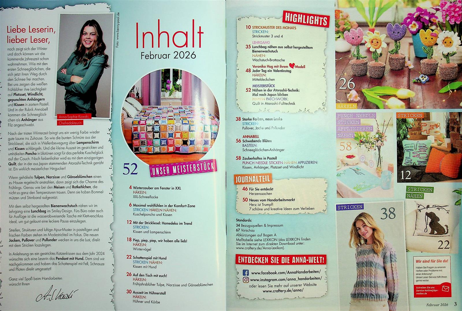 Neben den erwähnten Handarbeitstechniken bietet Anna, eine der ältesten Handarbeitszeitschriften Deutschlands, die dazugehörigen Anleitungen und Vorlagen und stellt auch hübsch anzusehende Handarbeiten für Kinderhände vor. Da hätte vielleicht der erwähnte Topflappen auch noch seine Anhängerschaft gewonnen. Mit einer breiten Ideenpalette stellt das Heft liebevolle Handarbeiten vor, die von modernen Wohnaccessoires und Dekorativem zum Selbermachen für alle gängigen Handarbeitstechniken geeignet sind. Dazu finden Sie in der Anna Anleitungen für Pullover, Jacken und Accessoires für die Anfängerin bis hin zur geübten Handarbeiterin. Das Magazin schreibt einen Strickwettbewerb aus und organisiert Strickreisen z.B. nach Salzburg. Frau Christine Müller, die Chefredakteurin der Anna, spürt die neuesten Trends für Sie auf, begeistert für ausgefallene Klassiker und behält den Überblick über die Vielseitigkeit der Handarbeiten.