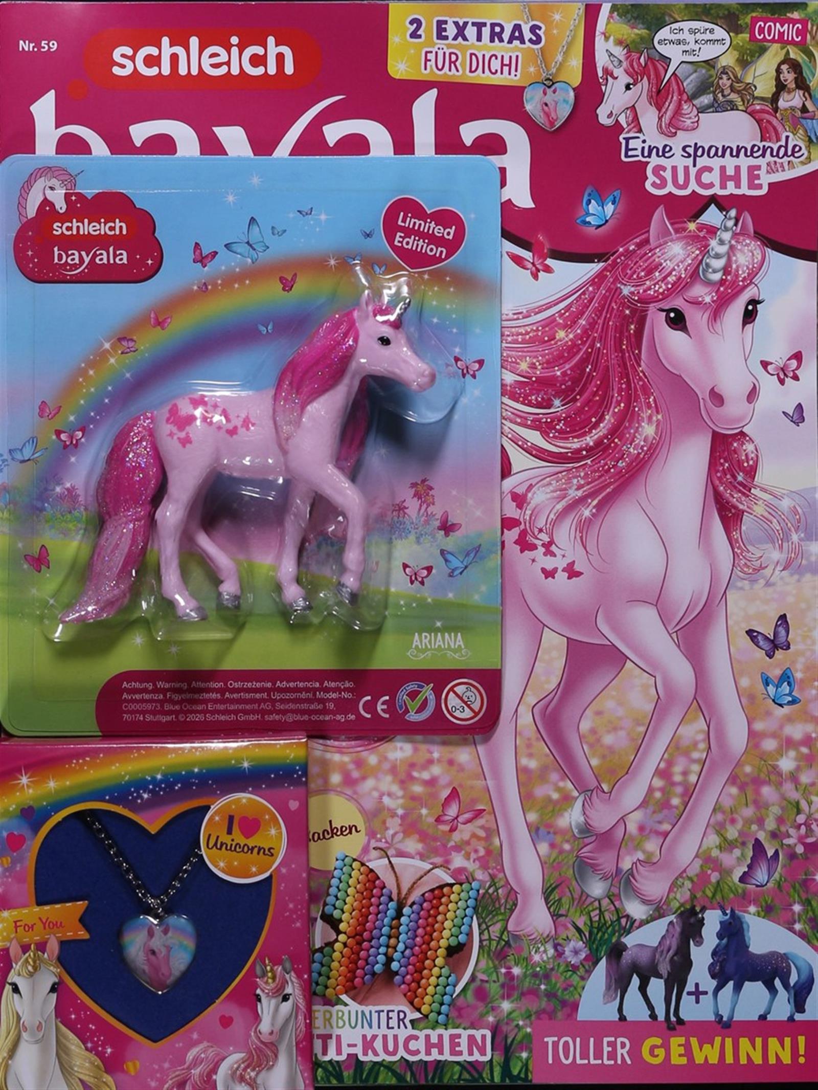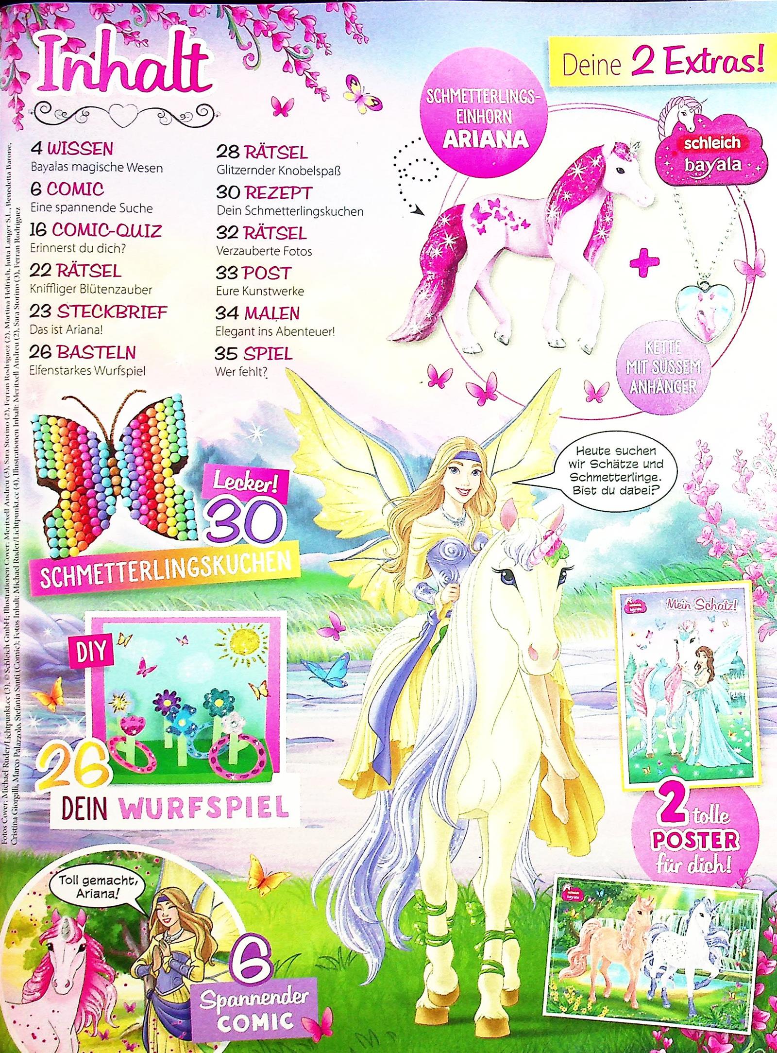 Funkelnd und zauberhaft! Diese Ausgabe nimmt alle Einhorn-Fans mit in die magische Welt von Bayala. Im Comic-Abenteuer geht es auf eine spannende Suche. Dazu gibt es gleich 2 Extras: die Limited-Edition-Figur Ariana – ein pinkes Glitzer-Einhorn – und eine „I Love Unicorns"-Herzkette. Außerdem warten ein bunter Perlen-Kuchen zum Nachbacken und ein toller Gewinn auf alle Leser:innen!