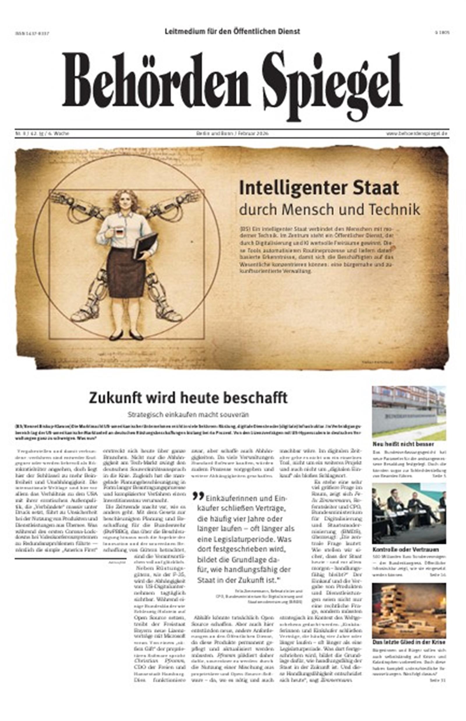 Die Zeitschrift Behörden Spiegel bietet aktuelle Berichte, Hintergrundanalysen und Praxisberichte aus Verwaltung, Politik, Innerer Sicherheit und Digitalisierung. Mit Interviews, Porträts und Fachbeiträgen zu Recht, Personalwesen, IT und öffentlicher Beschaffung richtet sich das Blatt an Entscheider und Fachkräfte. Zusätzlich informiert es über Forschung, Weiterbildung und Innovationsprojekte im öffentlichen Sektor.