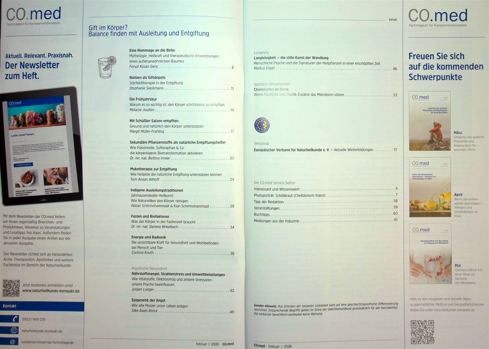 Medizin und Bewusstsein – das ist die redaktionelle Leitlinie von CO.med, die fundiert und unabhängig verfolgt wird! Thematisch bildet CO.med die komplette Bandbreite der Komplementärmedizin mit einer Fülle praxisrelevanter Themen ab. Im Fokus stehen die zukunftsweisende Verknüpfung von Wissenschaft und Praxiserfahrung, das Aufzeigen von Synergien und das Vernetzen von Potenzialen. Das schafft Bewusstsein! Die einzigartige Vielfalt schafft Raum für Neues, das sich ohne ideologischen oder dogmatischen Druck entfalten kann. Wer nicht nur sein Fachgebiet vertiefen will, sondern auch eine Gesamtschau der Komplementärmedizin sucht, der findet im Fachmagazin CO.med die geeignete Lektüre. Die CO.med bietet Fachinformationen für Heilpraktiker sowie komplementärmedizinisch arbeitende Ärzte und sonstige Therapeuten.