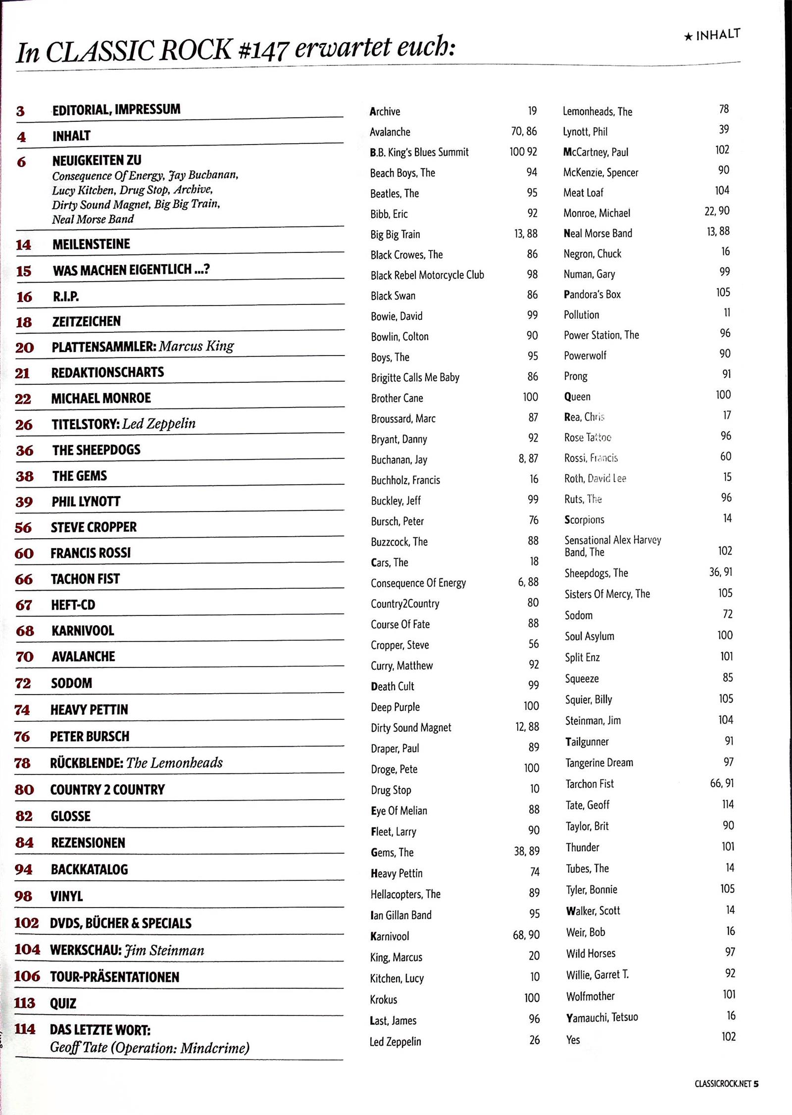 Ausführliche „Histories“ – Geschichten aus den Anfängen der Rockmusik, über Bands, die nicht nur Welterfolge performten, sondern die Welt, Generationen von Musikliebhabern prägten, besitzen einen hohen Stellenwert in der Classic Rock. Dabei reicht die Spannbreite von AC/DC bis ZZ Top, was deutsche Rockbands wie die Scorpions mit einschließt.
