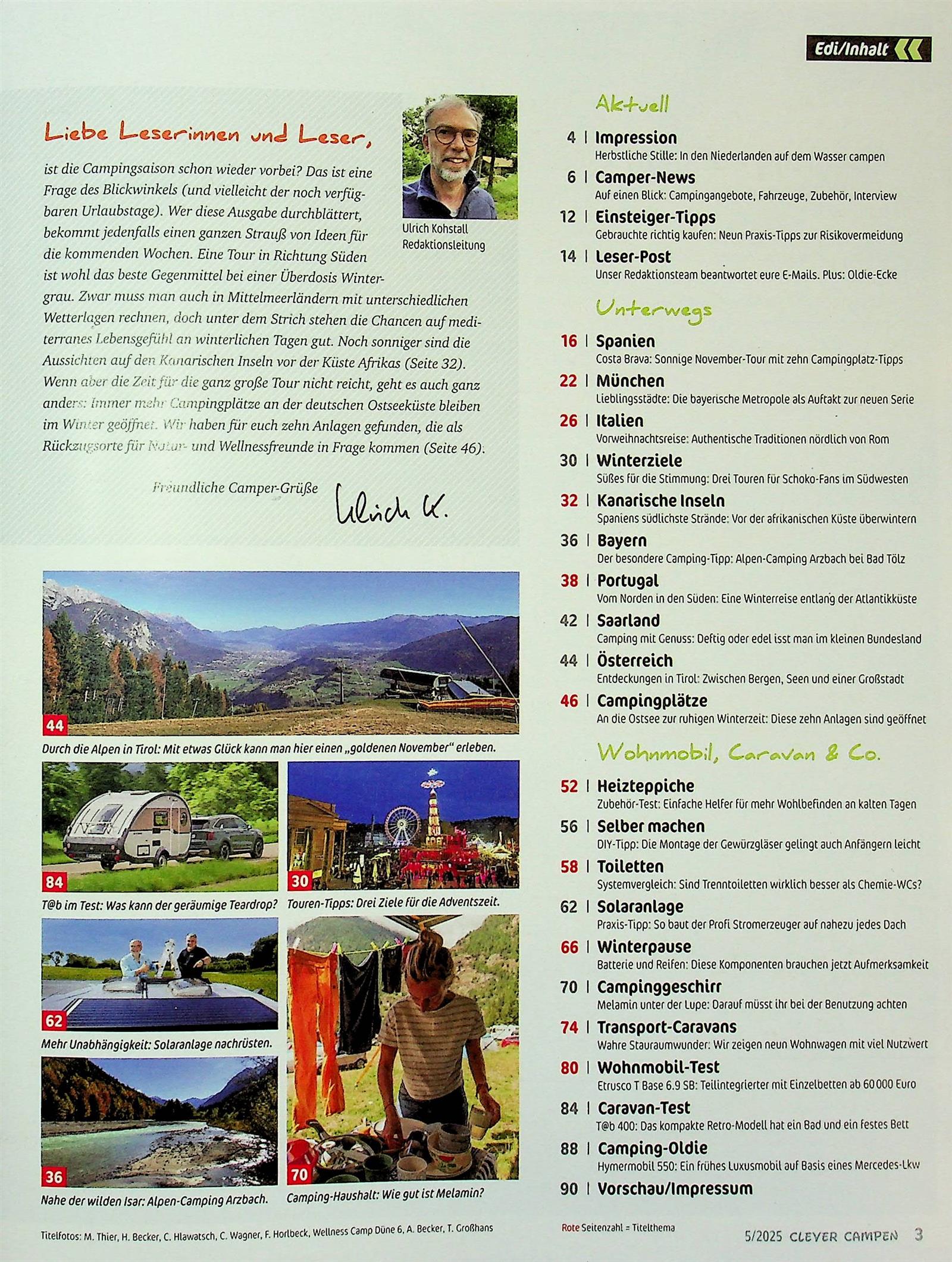 In jeder Ausgabe finden sich wertvolle Tipps zur passenden Tourengestaltung – den schönsten und originellsten Campingplätzen inklusive. Ratgeber und Entscheidungshilfe ist das Magazin zudem bei der Auswahl des passenden Reisegefährts. Reisemobil oder Caravan, Kauf oder Miete, neu oder gebraucht, gerade Einsteiger stellen sich zu Beginn der Camperkarriere viele Fragen – die Vollblut-Camper von Clever campen beantworten sie kompetent und verständlich, legen ihren Fokus auf die Einsteigermodelle.
