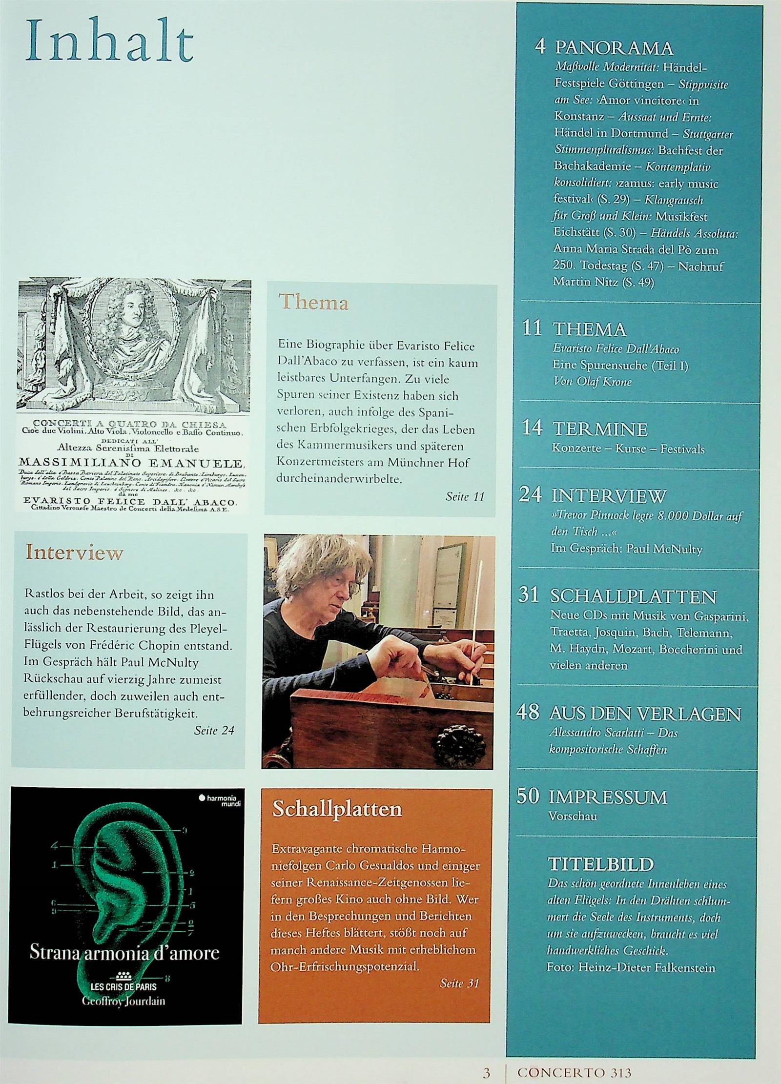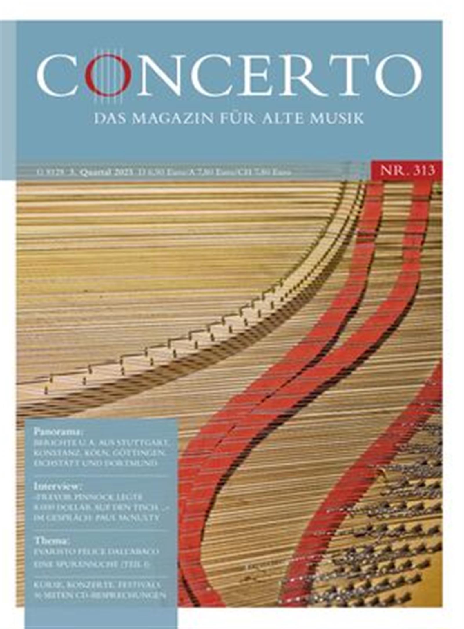 In diesem besonderen Fachmagazin finden Sie alles, was die „Alte Musik“ zu bieten hat: neben aktuellen Berichten aus dem aktiven Musikleben gibt es Rezensionen von Aufführungen in ganz Deutschland und Österreich. Die Aufsätze zu Themen der Musikgeschichte, wie z.B. über die „Szenische Aufführungspraxis bei Johann Sebastian Bach“, „Mozart im Sog des Regietheaters“, die „Innsbrucker Festwochen der Alten Musik“ oder „Die Laute als Motiv in der deutschsprachigen Lyrik in Renaissance und Barock“ weisen eindeutig darauf hin, dass es sich bei den Machern der Concerto um leidenschaftliche Spezialisten handelt. Interessante Interviews aus der Fachwelt, wie z.B. das Gespräch mit der weltberühmten Cembalistin, Forscherin und Professorin Mitzi Meyerson oder das Interview mit Bachfest-Intendant Michael Mau, gewähren der Leserschaft einen Einblick hinter die Kulissen. Zudem werden neue Bücher, Noten und CDs besprochen, Termine für Konzerte, Festivals und Symposien bekannt gegeben. Die Rubrik für Kleinanzeigen darf natürlich in dieser Auflistung nicht fehlen.