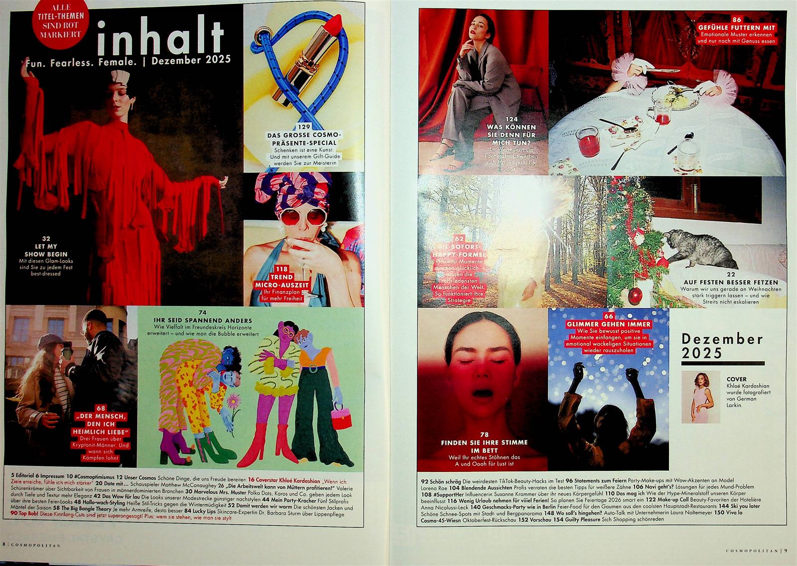 Eines der Erfolgsrezepte der Cosmopolitan ist ihre Vielseitigkeit. Auf der einen Seite widmet man sich der neuen Mode oder auch Kosmetik und Schönheit, andererseits nehmen jedoch auch Themen wie Beruf und Karriere oder die Erotik und Partnerschaft einen großen Raum ein. Das vom Verlag ausgegebene Motto lautet dabei: „fun. fearless. female“. Einmal im Jahr verleiht die Redaktion den begehrten „Prix de Beauté“ bei dem in 15 Kategorien die besten Neuheiten aus dem Kosmetikbereich prämiert werden.