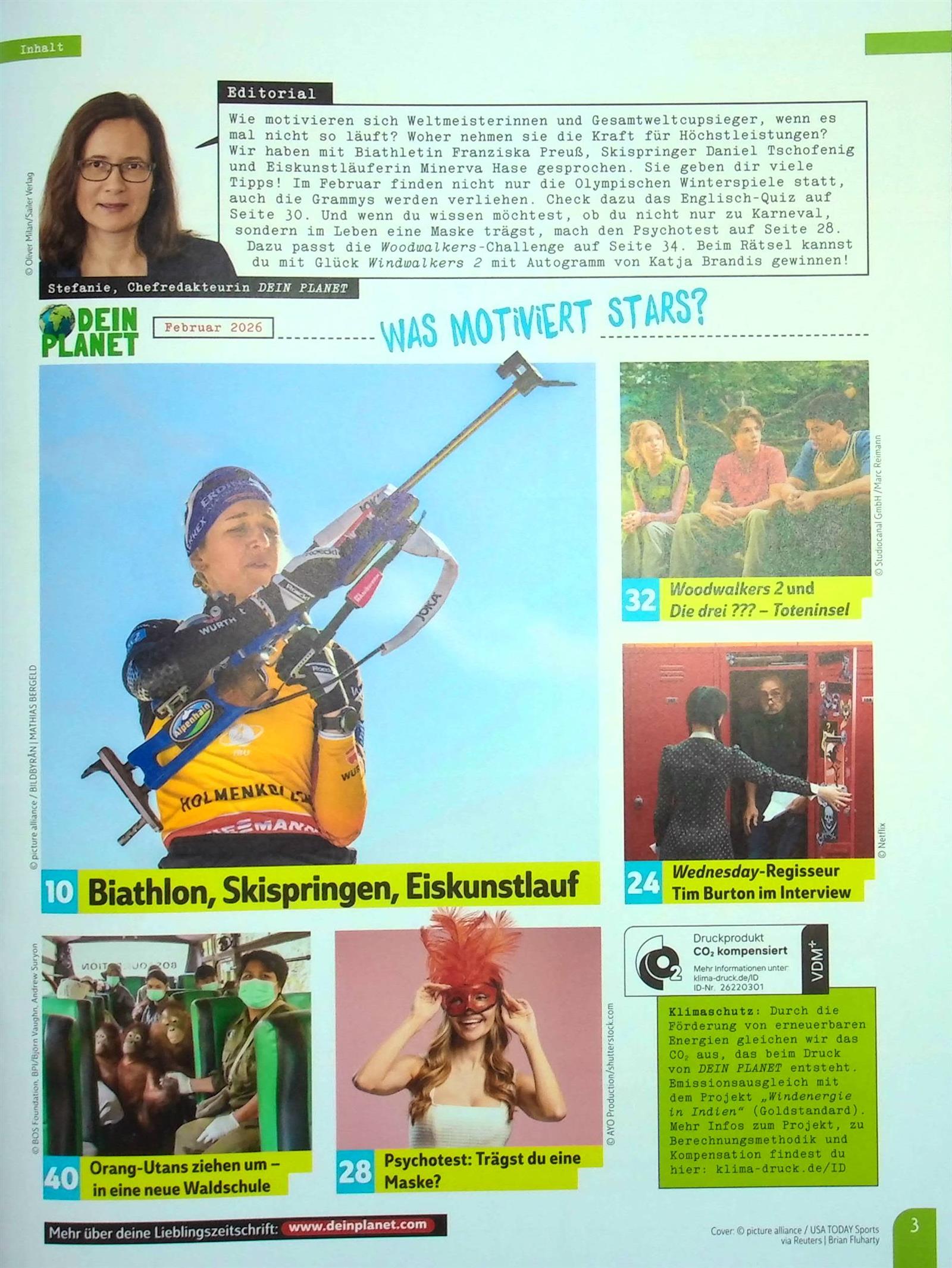 Was ist das Erfolgsgeheimnis der Champions? Skispringer und Gesamtweltcupsieger Daniel Tschofenig, Biathletin und Weltmeisterin Franziska Preuß sowie Eiskunstläuferin und Europameisterin Minerva Hase geben in der Februar-Ausgabe von Dein Planet tolle Motivations-Tipps.