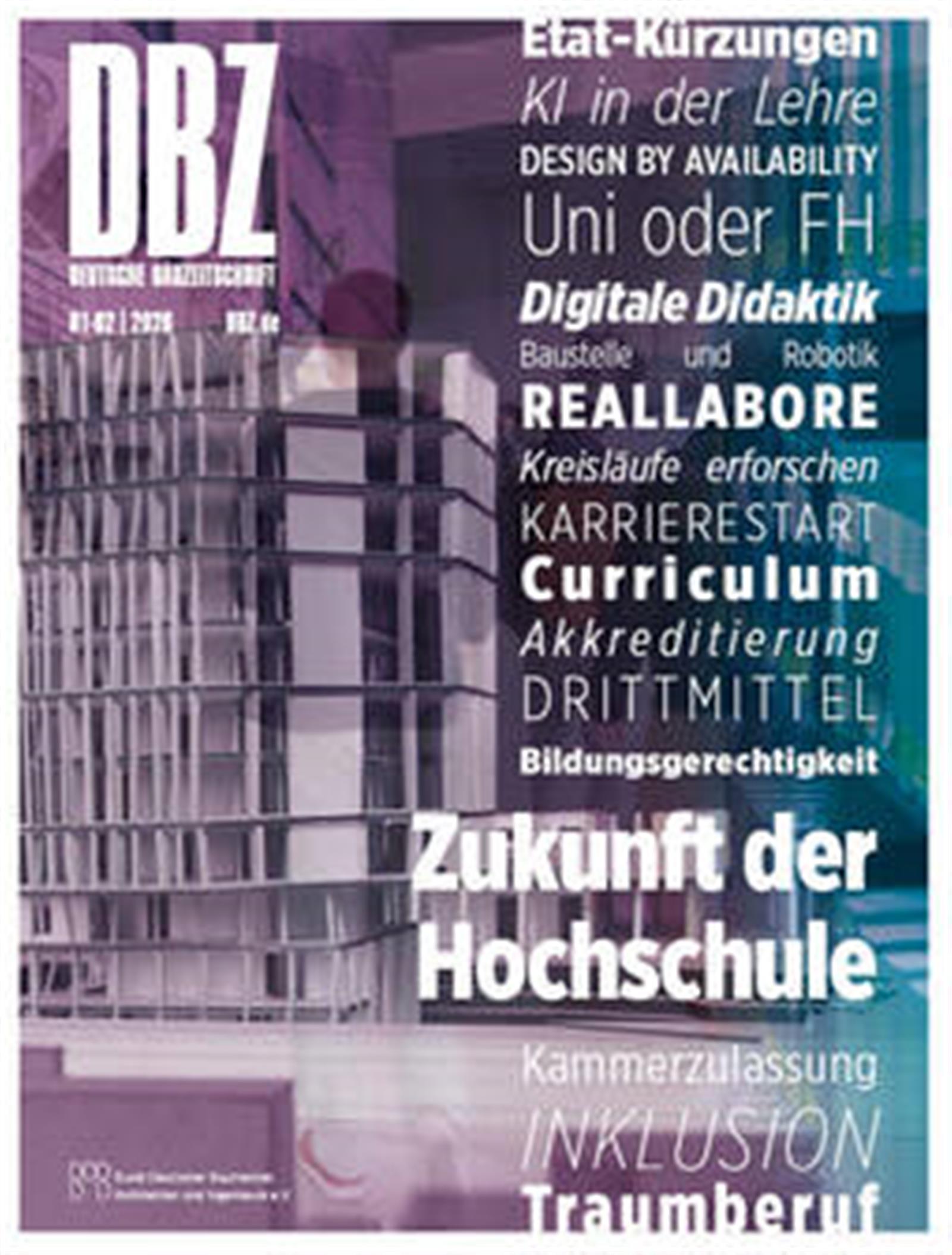Die DBZ Deutsche Bauzeitschrift beleuchtet als Fachmagazin detailliert Bauprojekte, um Lösungen und Praxisbezug für den Berufsalltag von Architekten und Bauingenieuren zu finden. Mit konkreten Beispielen aus der Baupraxis hat das Magazin einen hohen Nutzwert und steht für Relevanz, Kommunikation und Zusammenarbeit auf Augenhöhe, für alle am Bau beteiligten Fachleute.