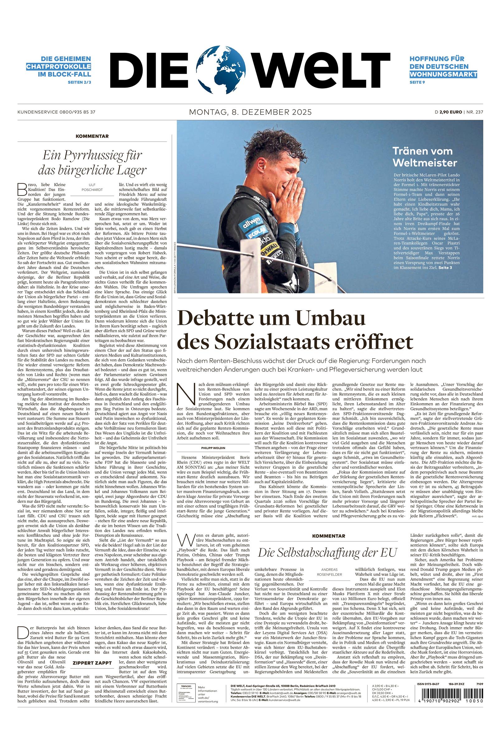 DIE WELT ist eine der bekanntesten deutschen überregionalen Tageszeitungen und bietet dem Leser wochentäglich umfassende Artikel über aktuelle Themen und Nachrichten aus der ganzen Welt. Von Artikeln über globales politisches Geschehen bis hin zu Inhalten wie Ausbildung oder Rente in Deutschland reicht das vielfältige Themenspektrum.