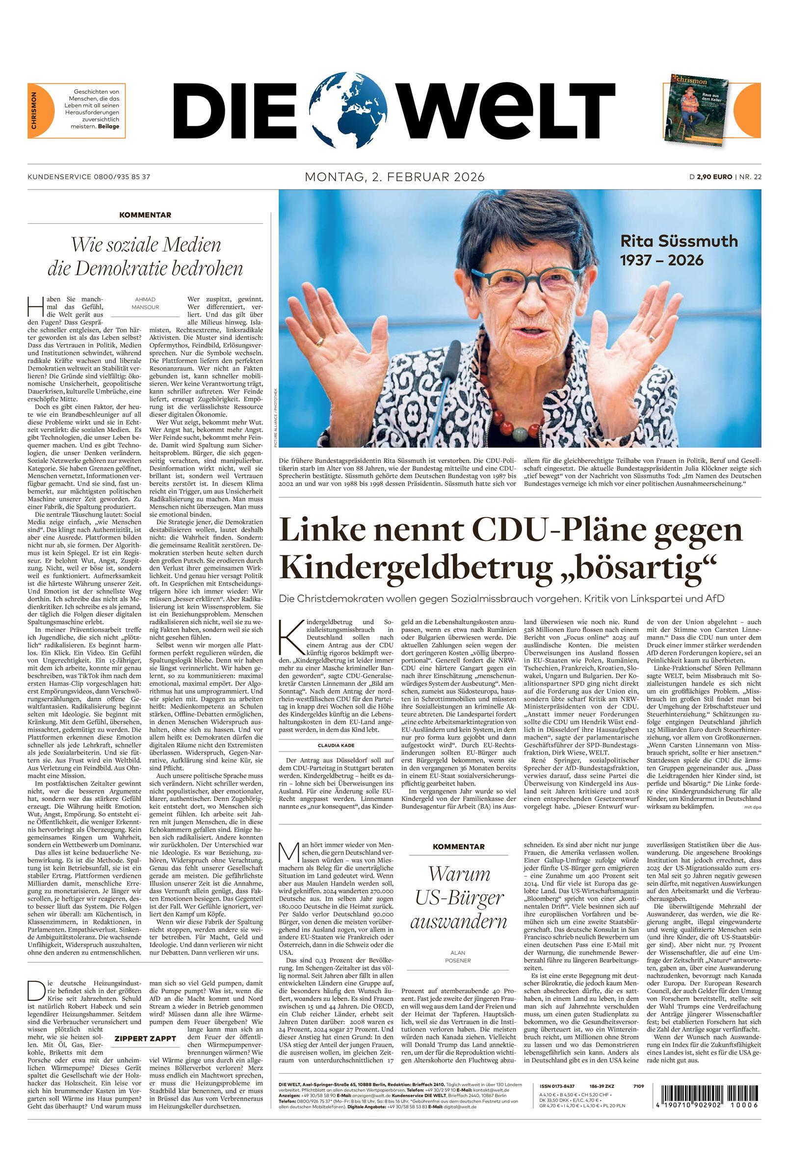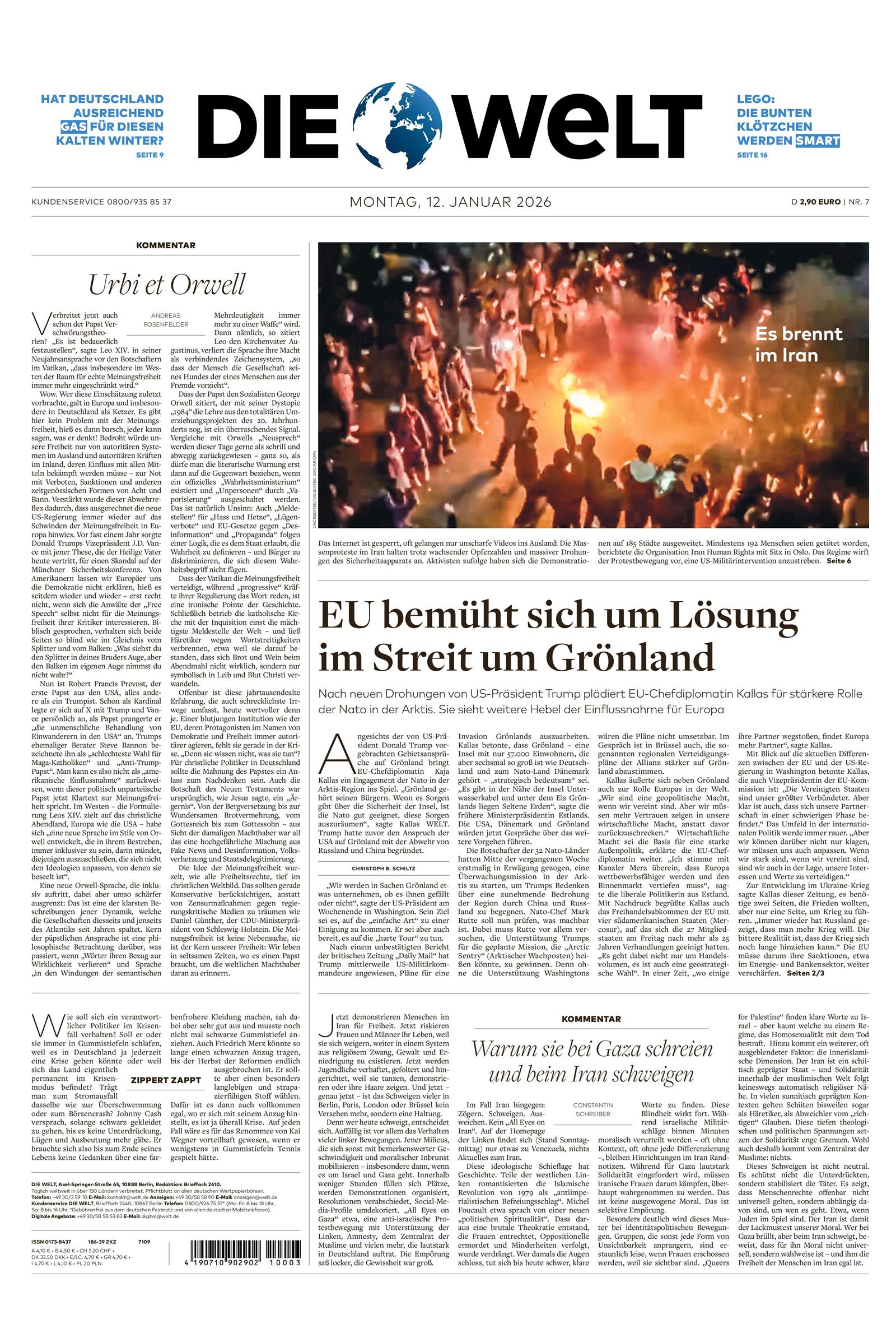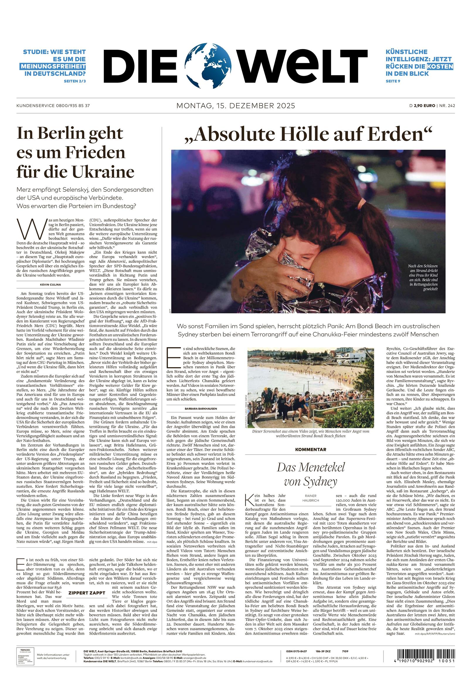 Die Zeitung DIE WELT ist eine moderne Tageszeitung mit großen, sorgfältig recherchierten Themen und ausführlichen Kommentaren. Das renommierte Blatt ist in die Ressorts Politik, Wirtschaft, Finanzen und Feuilleton unterteilt und bietet seinen Leser*innen klar strukturierte Nachrichten, Analysen und Einschätzungen. DIE WELT ist eine der führenden Zeitungen Europas und wird dennoch als bodenständig und geradlinig beschrieben. Tagesaktuell relevante Nachrichten aus der ganzen Welt, ihre Verlässlichkeit und die Vielfältigkeit der Themen sind weitere Gründe für die Beliebtheit dieser klassischen Tageszeitung.