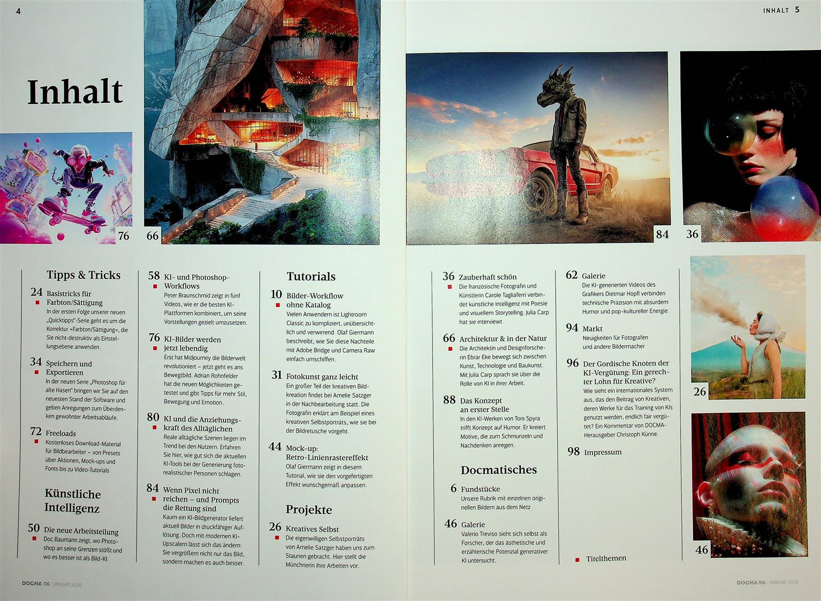 Docma ist ein kompaktes Magazin, das wichtige Praxistipps für die Bearbeitung von Fotos gibt, egal ob mit Photoshop oder Lightroom. Die Arbeitstechniken, die technischen Praxislösungen und Photoshop-Tutorials, die in Docma zu finden sind, ermöglichen das eigenständige Training mi diesen Bildbearbeitungsprogrammen. Docma ermöglicht den Lesern diese Programme optimal zu nutzen, um z.B. das Austauschen von Hintergründen oder Hautretuschen vorzunehmen, damit nach einiger Zeit kreative Montagen entstehen. Das Magazin bietet auch Foto-News mit Schwerpunkt Bildoptimierung und informiert über neue Bildbearbeitungsprogramme, Plug-ins oder Effekt-Software. Docma vermittelt Wissen über digitale Arbeitstechniken und zeigt den Leserinnen und Lesern Schritt für Schritt das Entstehen herausragender Montagen und Illustrationen. Mit Berichterstattungen über Berufsbilder sowie technische Praxislösungen im Umfeld digitaler Bildbearbeitung, ist das Magazin auch wegweisend für alle, die sich in diesem Berufsfeld ausbilden möchten.