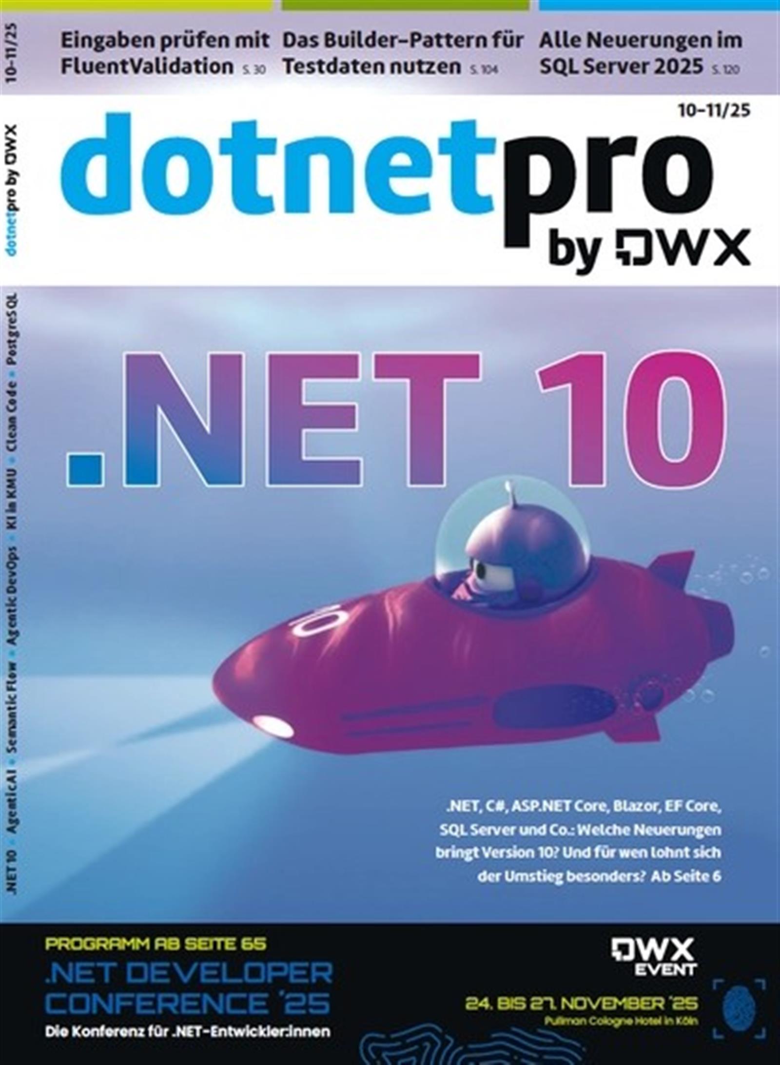Dotnetpro ist nach wie vor das führende europäische Magazin für professionelle Softwareentwickler, die Microsoft-Technologien einsetzen. Diese Fachzeitschrift arbeitet auf höchstem Niveau und bietet alle neuesten Informationen zur Software-Entwicklung für die .NET-Plattform. Die Zeitschrift erscheint monatlich.
