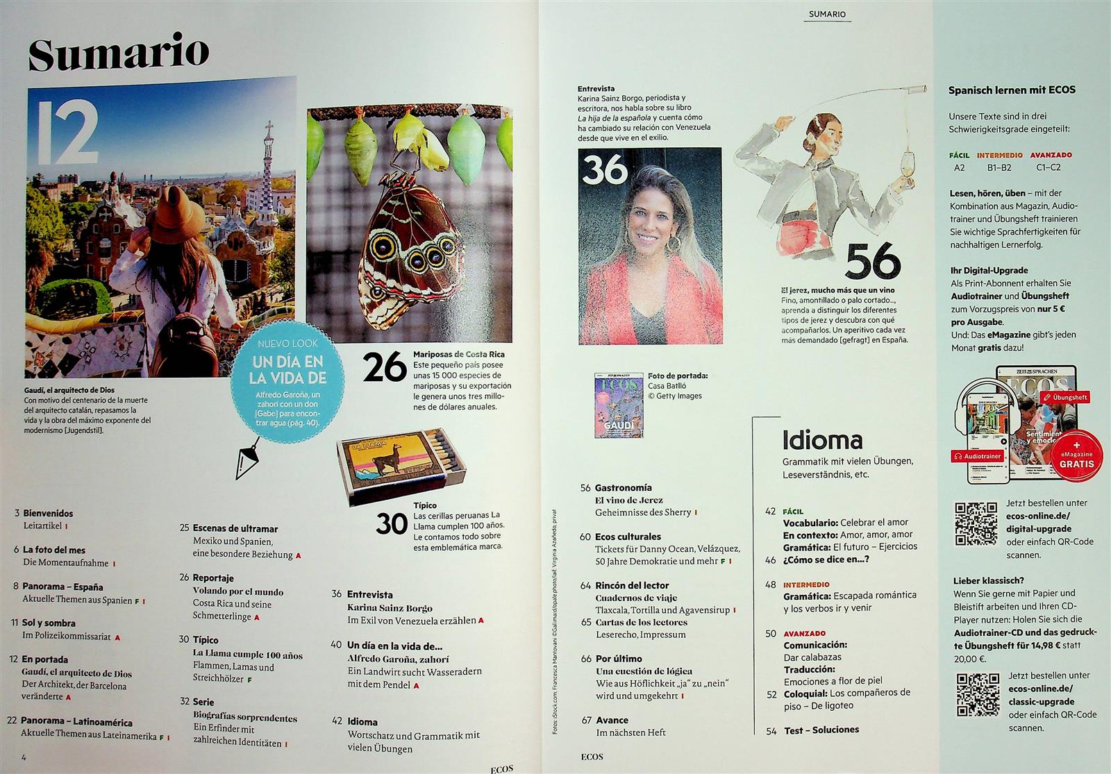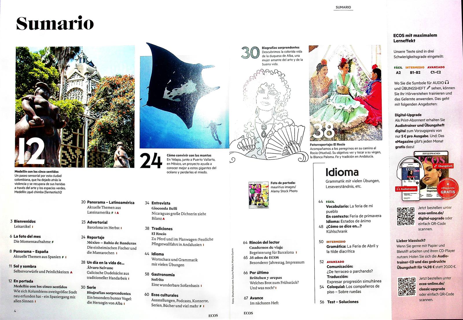 Unter dem Namen Ecos erscheint einmal monatlich ein Sprachmagazin zur Verbesserung der Spanischkenntnisse. Der Name bedeutet übersetzt soviel wie „Echo“ oder auch „Resonanz“ und passt damit bestens zu dem seit 1991 erscheinenden Heft.
