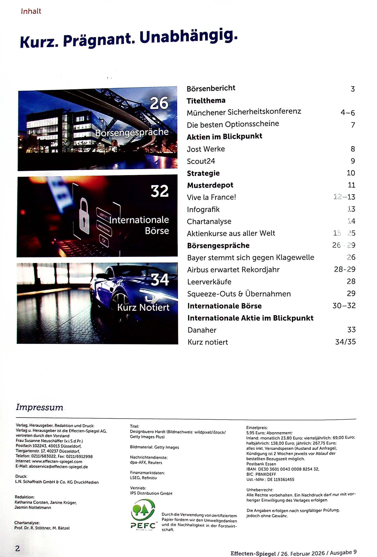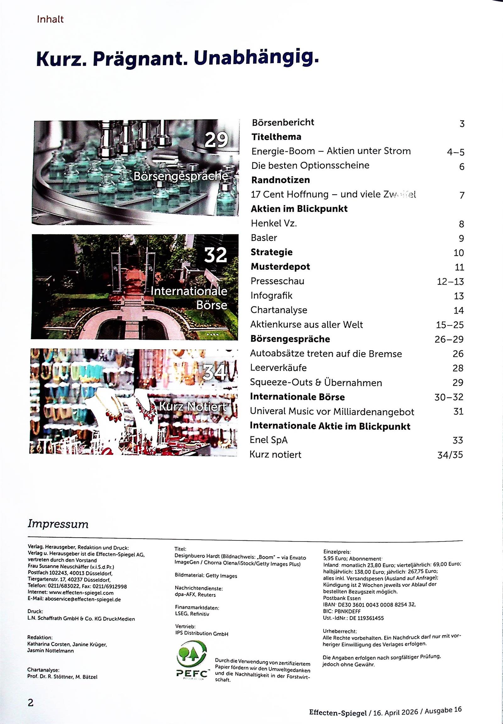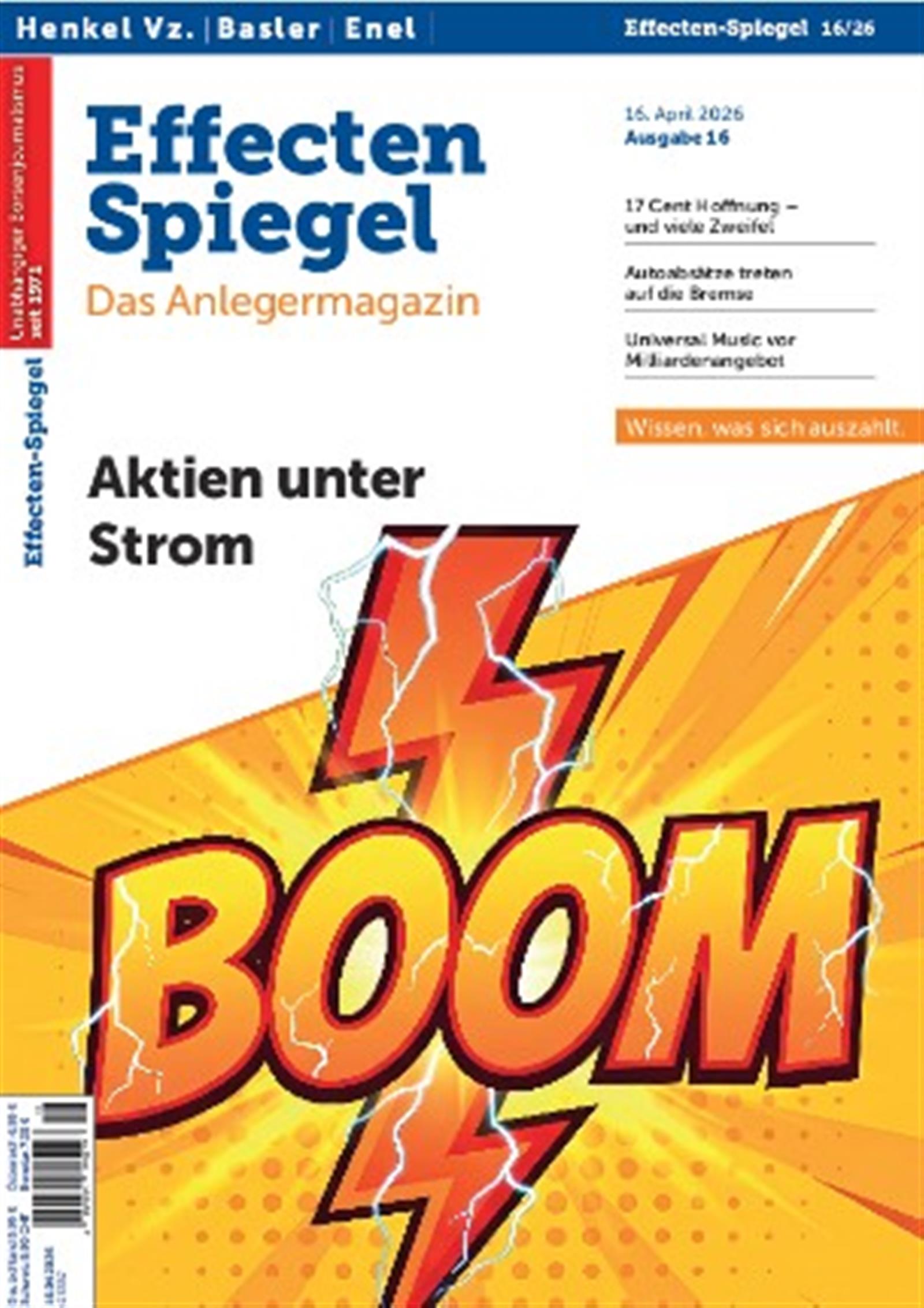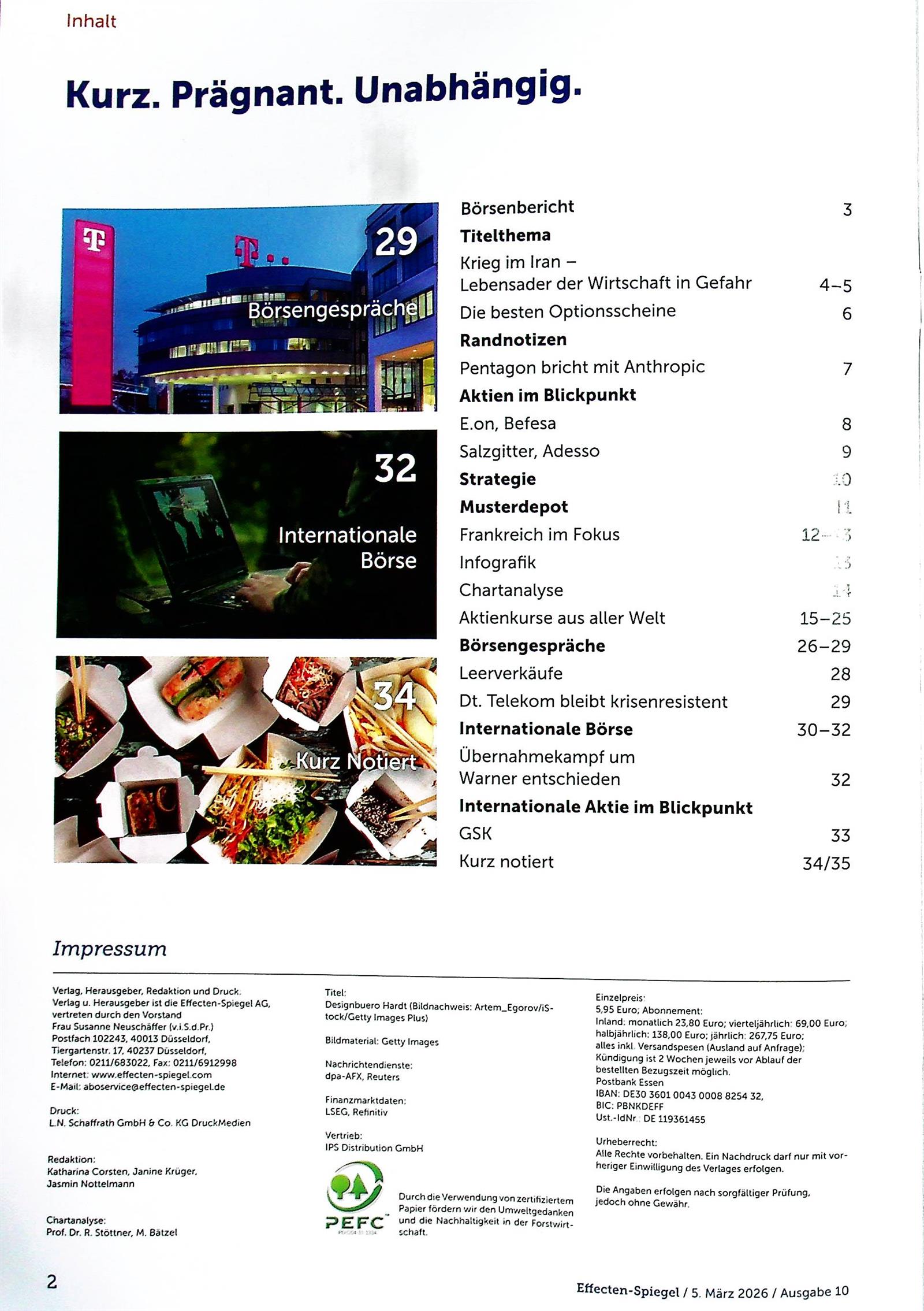 Die Zeitschrift Effecten-Spiegel ist einzigartig, weil sie über die deutschen und europäischen Grenzen hinausgeht und über die globale Situation der verschiedenen Märkte und deren Auswirkungen auf Deutschland informiert. Hier finden die Leser alles, was sie für den Aufbau ihres Portfolios benötigen.