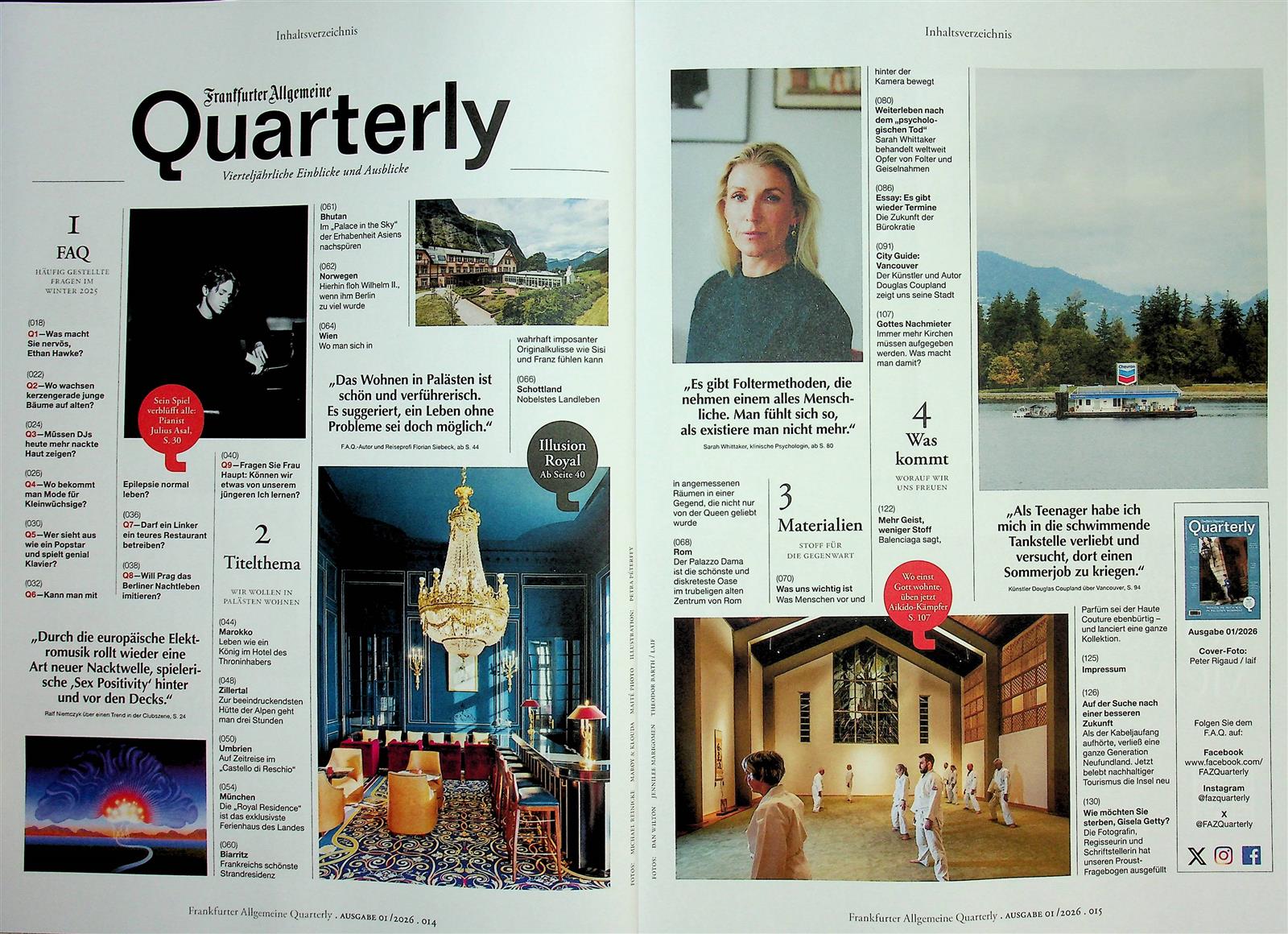 Nicht minder interessant ist das dritte Ressort, welches mit faszinierenden wie anregenden Geschichten Denkanstöße liefert. Geprägt von gesellschaftspolitischen, zukunftsrelevanten Themen wartet die FAZ Quarterly hier auf. Und das nicht nur mit dem geschriebenen Wort. Hochwertiges Bildmaterial prägt das Ressort, eröffnet neue Blickwinkel auf das Leben der Gegenwart und das Morgen. Einen Ausblick auf die Zukunft verspricht Ressort Nummer vier. Reportagen aus den Bereichen Design, Mode, Reisen und Style – zudem Bildstark umgesetzt – bildet seinen Kern und liefert die neusten Trends.