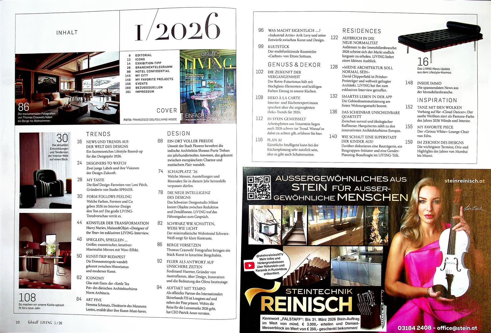 Falstaff Living ist ein Design- und Lifestyle-Magazin, das die Themen Interior-Trends, Design, Architektur und Immobilien umfasst. Das in Österreich ansässige Magazin ist nicht nur ein großartiger Stilberater und eine Inspirationsquelle, sondern auch ein Leitfaden für leidenschaftliche Experten in vielen Bereichen – wie Kunst, Architektur und Design –, die nach innovativen Analysen neuer Trends suchen. Insofern spielt es eine tragende Rolle bei der Bestimmung des Trends.