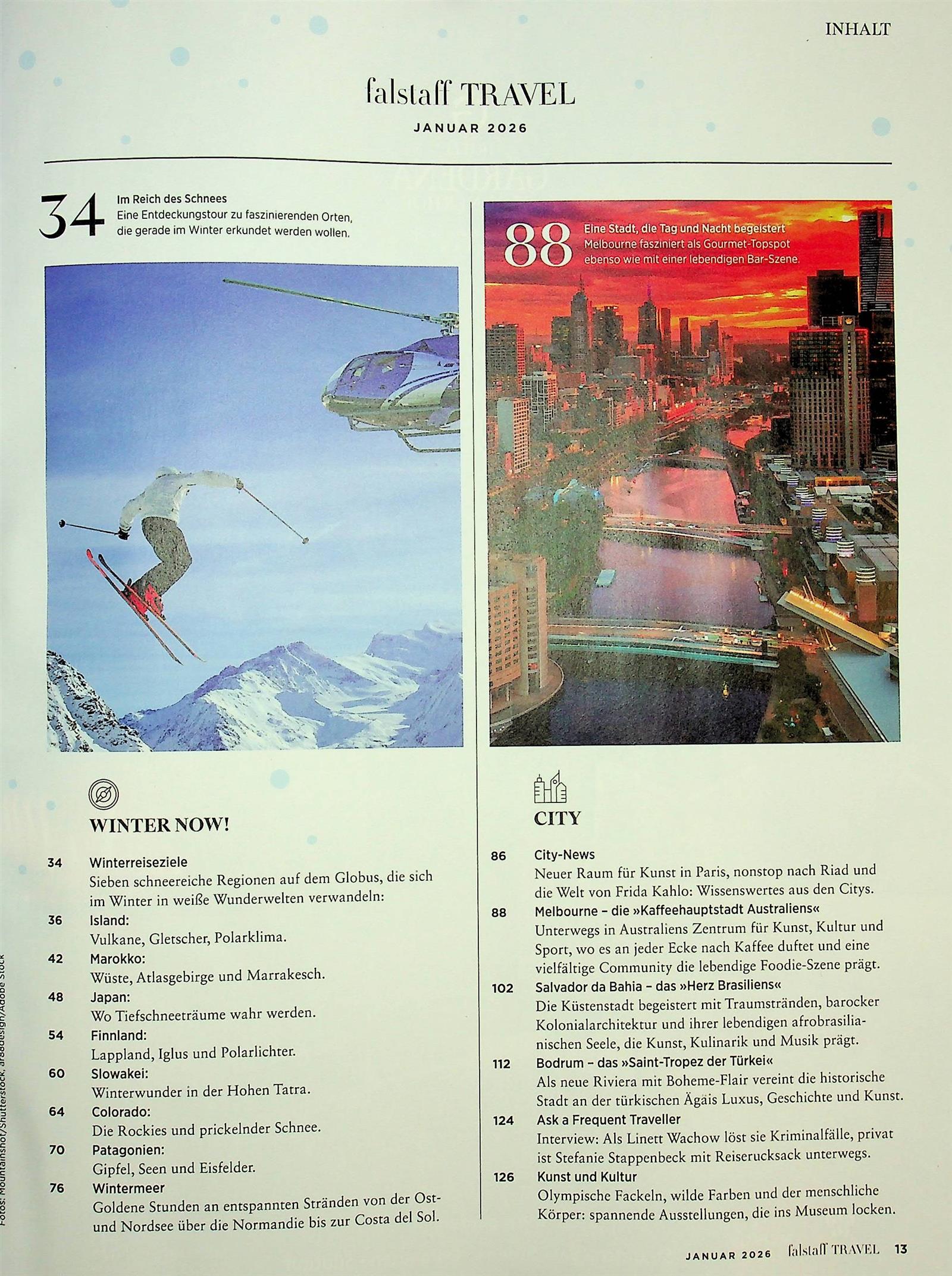 Die Zeitschrift Falstaff Travel bietet eine Vielzahl von Inhalten, die sich rund um das Thema Reisen und Genuss drehen. Sie richtet sich an anspruchsvolle Reisende und präsentiert die besten Reiseziele weltweit. Dazu gehören spannende Reportagen, die von luxuriösen Hotels bis hin zu geheimen Insidertipps reichen, die den Leser in die Welt des exklusiven Reisens entführen. Ein weiterer Schwerpunkt der Zeitschrift ist die Gastronomie, wobei Michelin-Sterne-Restaurants ebenso vorgestellt werden wie lokale kulinarische Highlights. Falstaff Travel bietet zudem spannende Interviews mit Reiseexperten und Gourmets, die ihre persönlichen Empfehlungen teilen. Damit bietet die Zeitschrift nicht nur Inspiration für zukünftige Reisen, sondern auch einen tiefen Einblick in die Kultur und deren einzigartigen Angebote.