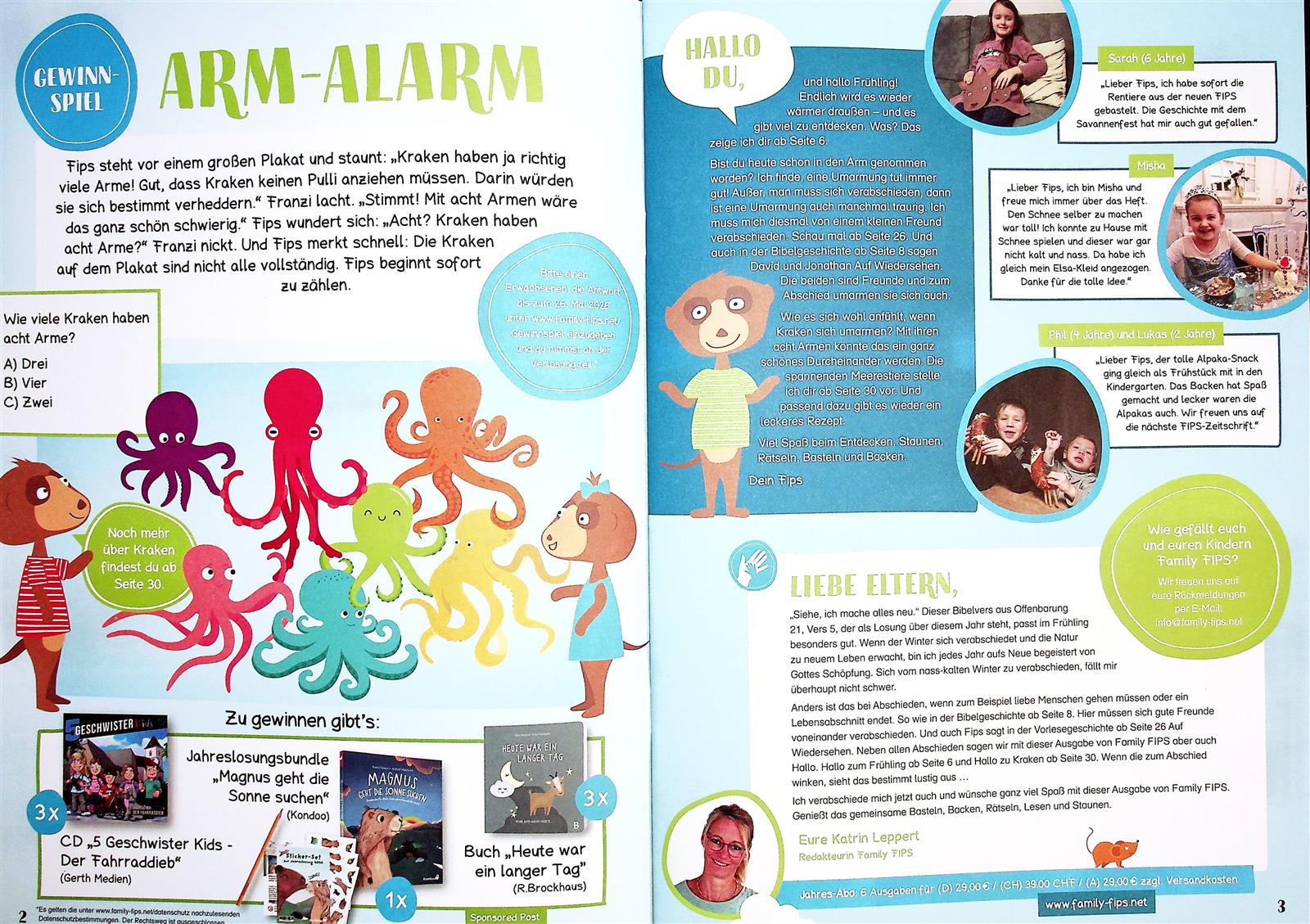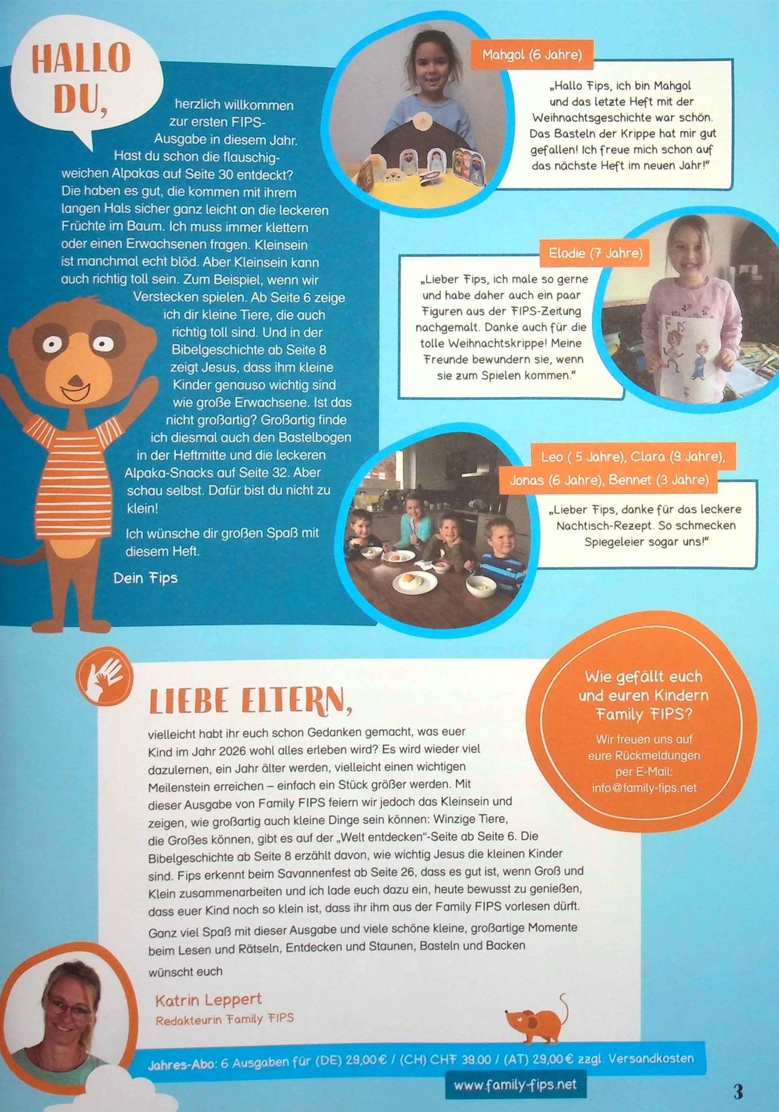 Fips! So heißt ein niedliches Erdmännchen, das Kinder zwischen 3 und 7 Jahren durch ein Heft begleitet, das eigens für diese wissbegierige Leserschaft konzipiert wurde. Fips nimmt die Kinder an die Hand, um mit ihnen zu spielen, zu entdecken, zu basteln und zu lernen. Dabei legt das kleine Erdmännchen großen Wert darauf, die Geschichten über Gott, die in der Bibel festgeschrieben wurden, spannend und interessant weiter zu erzählen. Fips hat wohl auch eine Familie und deswegen heißt dieses Magazin Family Fips.