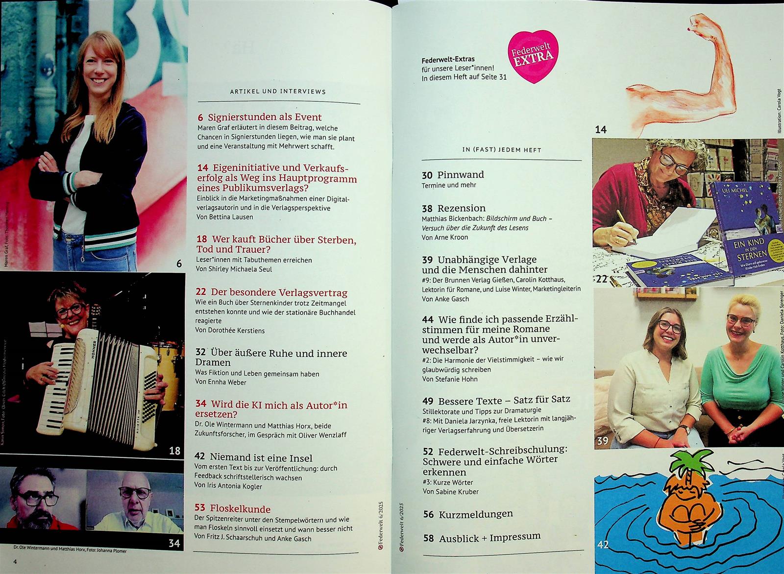 Jeder Schriftsteller hat einen eigenen Stil; seine Prosa, seine Sprache, seine Struktur, all das zusammen bildet eine Signatur, die sich über die Werke eines Schriftstellers erstreckt. Federwelt weiß um die Bedeutung des Stils und gibt die Werkzeuge an die Hand, mit denen die Leser eigene Stimme als Autor entwickeln können. Sie führt wertvolle Interviews mit renommierten Schriftstellern, in denen sie ausführlich darlegen, wie sie an das Thema Schreiben mit eigenem Stil herangehen und dabei ihren Weg der Reifung als Autor aufzeigen. Federwelt erkennt auch an, dass das Leben eines Schriftstellers oder Autors in der Regel kein solidarischer Akt ist, und bietet aufschlussreiche Artikel darüber, wie man ein Team aufbaut, das effektiv kommunizieren kann. Neben dem Schreiben und der Teambildung werden auch die Hintergründe für die Veröffentlichung eines literarischen Werks aufgezeigt.