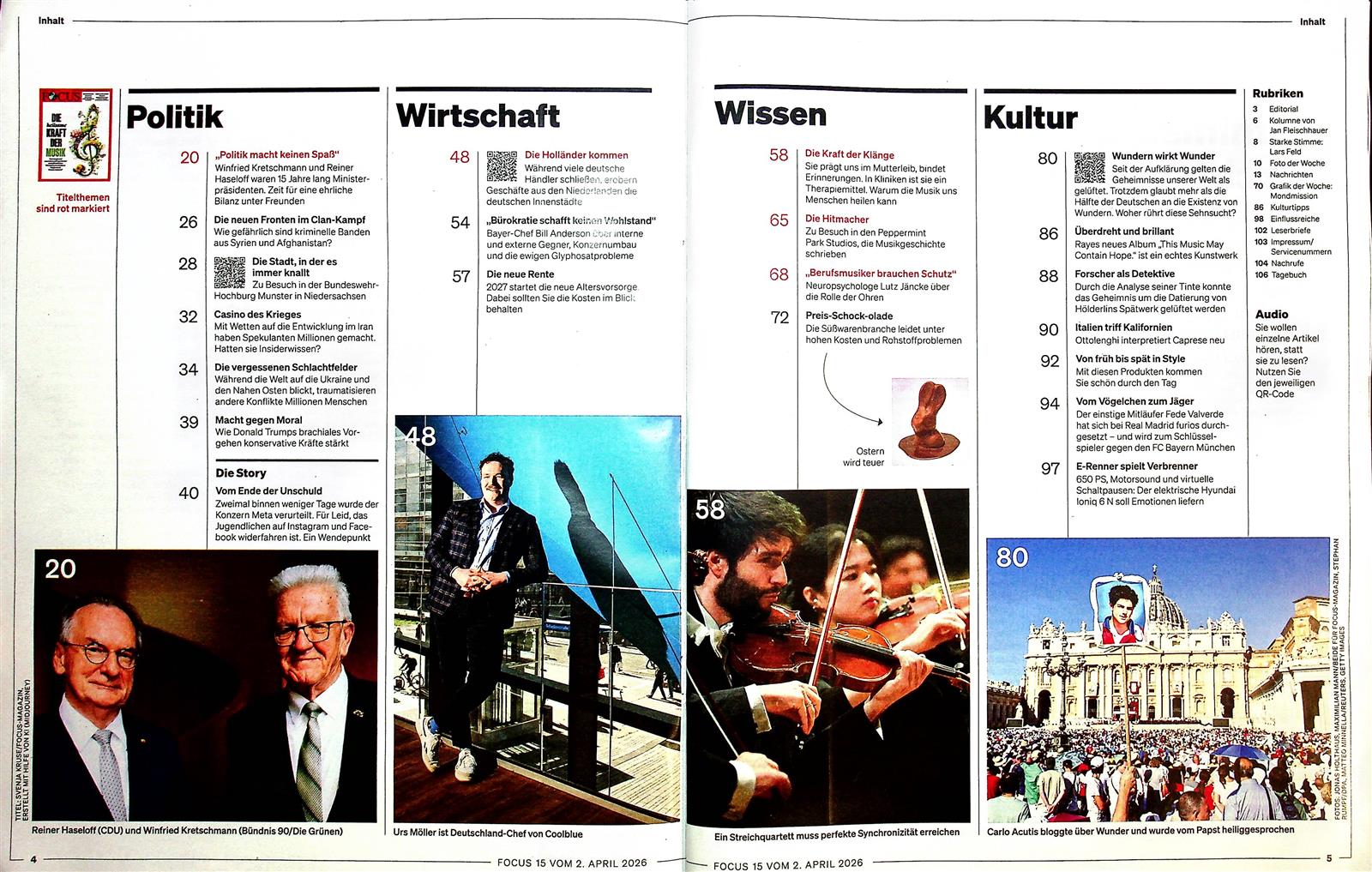 Mit einem Focus Abo erwartet die Leser das gesamte Spektrum gesellschaftsrelevanter Themen. Gegliedert in sieben Rubriken liefert die Zeitschrift nicht nur Nachrichten, sondern nützliche Fakten und Einordnungen. Unterstützt werden die Berichte mit Bildern und aufschlussreichen Infografiken. Politische Diskurse und wirtschaftliche Entwicklungen bilden die Basis in seiner Themenwelt. Geschehnisse werden eingeordnet, die Geschichten und Persönlichkeiten dahinter beleuchtet. Kompetente Analysen und Handlungsstrategien rund um das Anlage- und Finanzwesen warten auf den Leser in der Rubrik Finanzen.