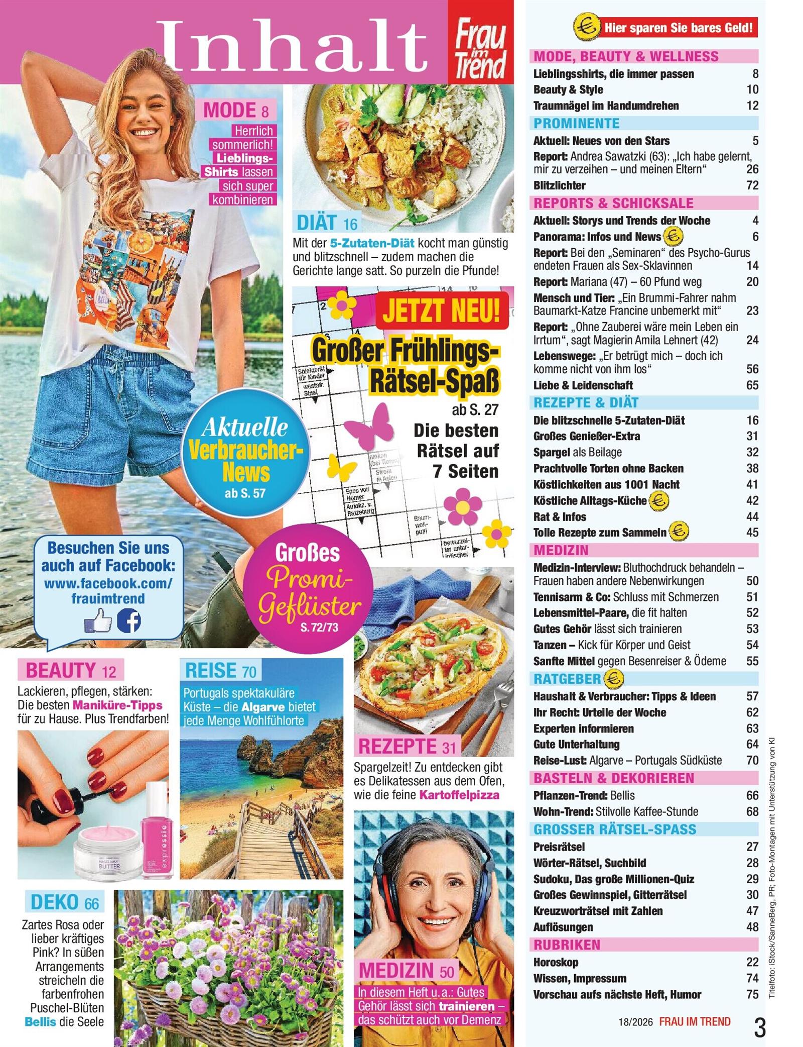 Einfach mal eine Auszeit vom Alltag, die Gedanken schweifen lassen – Pause machen und trotzdem viel erfahren. Entspannende Unterhaltung und praktische Ratgeberartikel – die Frau im Trend kann beides und ist eines der beliebtesten wöchentlich erscheinenden Frauenmagazine.