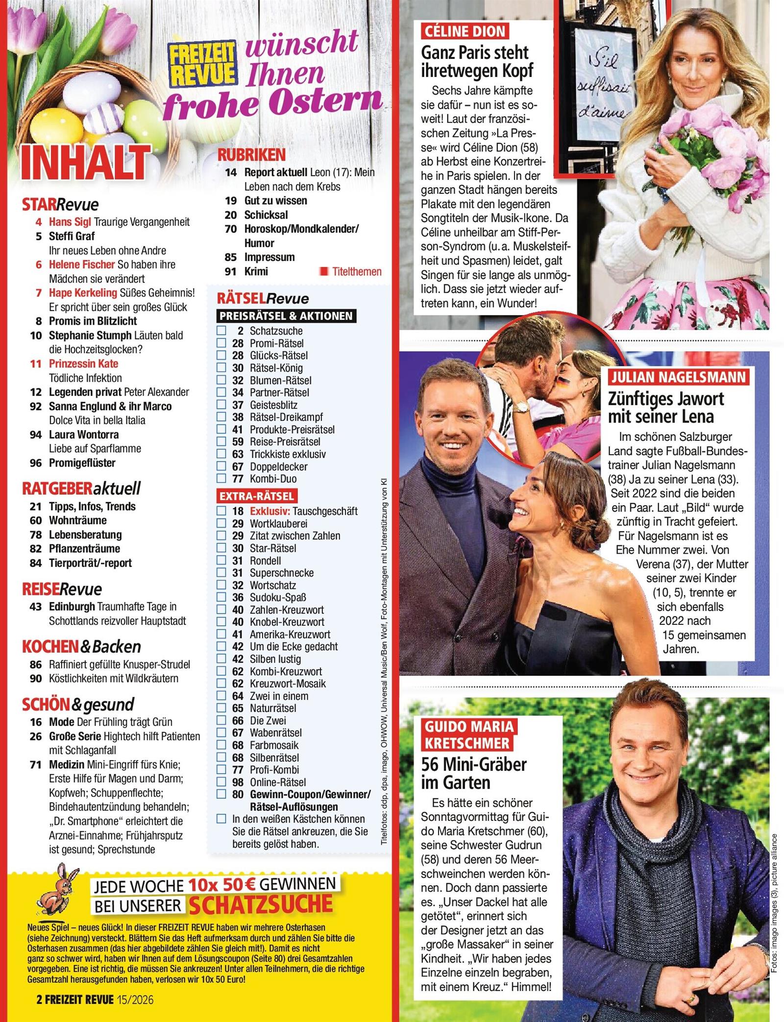 Viele Bildchen, wild zusammen geschachtelt auf einer Seite, wenig Text, zuviel Werbung, aber die Zeitschrift ist ideal für Rätselfreunde, Preiskreuzworträtsel, Sudoku, alles einem Fan gefällt diesbezüglich; es ist verschienes präsent hier, Klatsch und Tratsch von Adeligen und Stars,ein bißchen Gesundheit, kochen, Horoskop, Dekotrends, Rätselseiten, und Werbung...