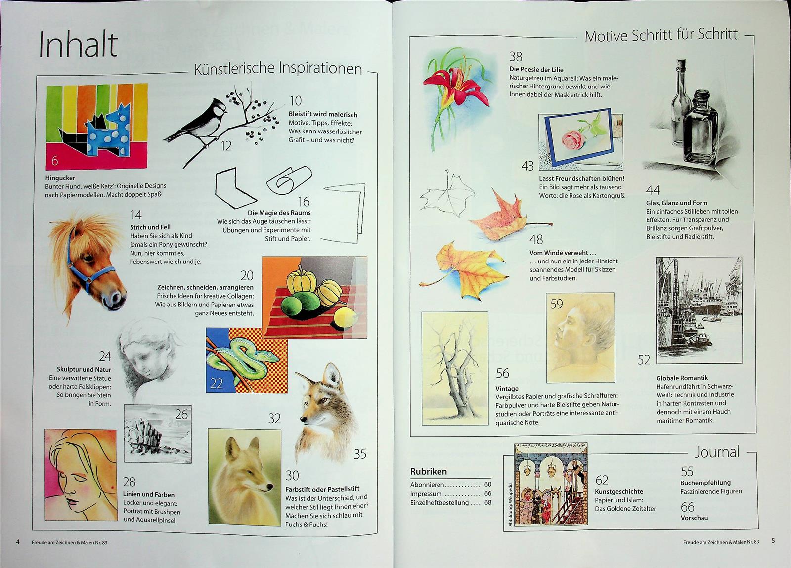 Freude am Zeichnen & Malen ist das führende Magazin für alle, die gerne zeichnen: inspirierend, unterhaltsam und lehrreich für Anfänger wie für ambitionierte Hobbykünstler. Für kreative und künstlerische Erlebnisse sorgen Bildbeispiele von einfach bis anspruchsvoll, klare Anleitungen, Grundkurse und wertvolle Ateliertipps, auch in den Anleitungsvideos, die jede Ausgabe online begleiten.