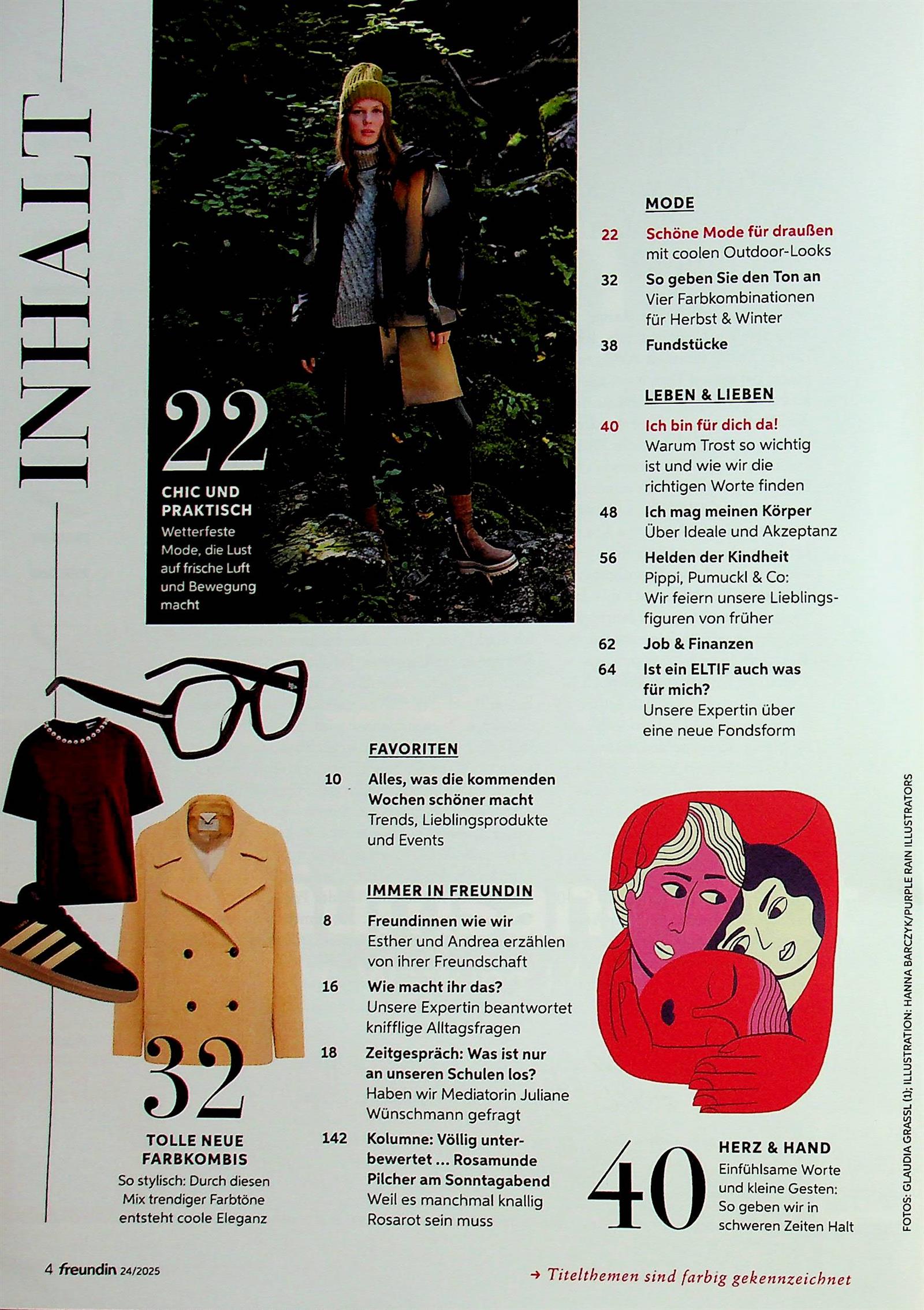 Haben Sie eine Freundin, die gut informiert ist über Mode, Beauty, Lifestyle und Co. Die mit Ihnen alle 14 Tage auf Shopping-Tour geht, Sie berät, aber Ihnen nichts aufzwingt. Eine Freundin, die sich traut, auch offen Fragen der Gesundheit und Partnerschaft anzusprechen, die immer für Sie da ist, wenn Sie sie brauchen und Sie gut unterhält und versteht. Wenn nicht, ist bestimmt die Freundin, die moderne unaufgeregte Frauenzeitschrift, Ihr passender Begleiter durch das Jahr. Die seit Ende der 40er-Jahre erscheinende Zeitschrift erfreute, und erfreut Generationen von Frauen, weiß, was sie interessiert und macht es zu seinen Themen.