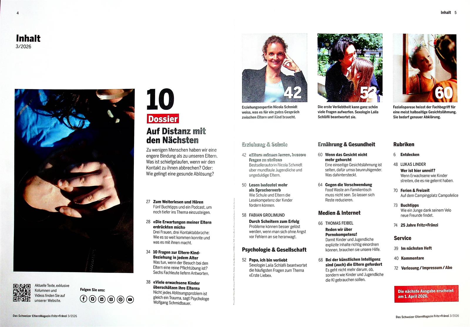 Erziehung, Schule und Berufsplanung, Gesundheit, Freizeit und interkulturelles Zusammenleben: Die Schwerpunkte bilden ein breites Spektrum, das vertieft auf Fragen der Pubertät, des Erwachsenwerdens und möglicherweise damit verbundenen Probleme, Konflikte und Risiken eingeht. Gespickt mit Lern- und Medientipps lässt das Magazin Fachleute zu brisanten und aktuellen Themen zu Wort kommen, tabuisierte Themen werden entzerrt und fundiert aufgearbeitet.