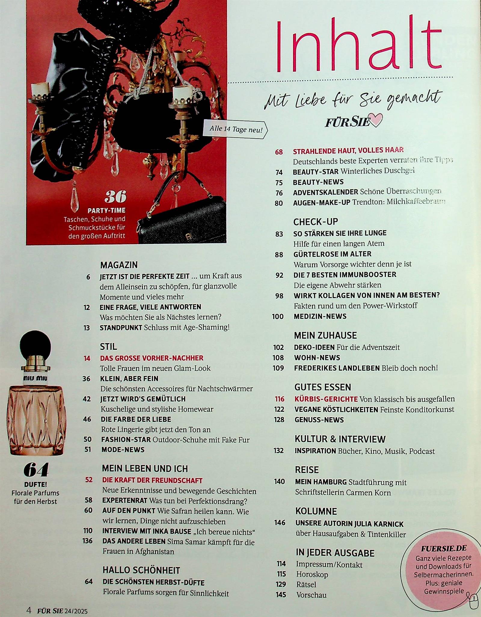 Natürlich wendet sich auch die Für Sie vor allem an Frauen und versteht sich damit als Konkurrenz oder interessante Ergänzung zu Magazinen wie der Freundin, der Donna oder auch der Tina.