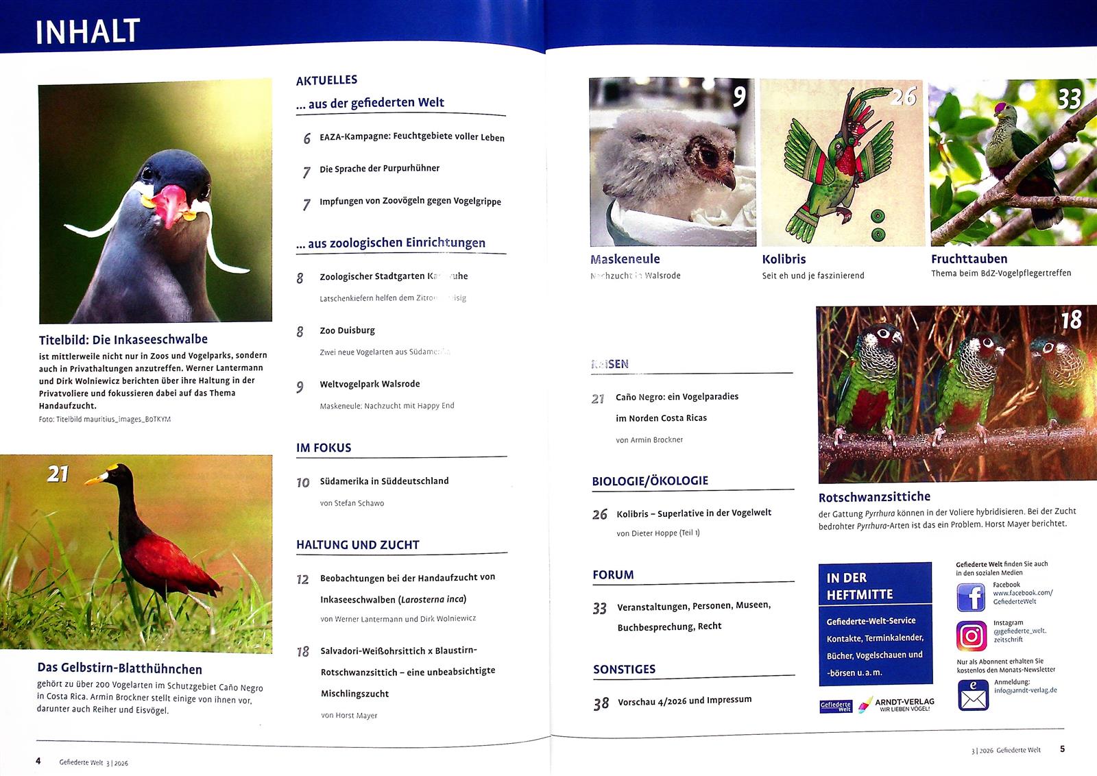 Das Gefiederte Welt Magazin berichtet über die gesamte Vogelwelt, regelmäßig stehen Wald- und Wildvögel, Prachtfinken, Greifvögel, Ziergeflügel und Wasservögel im Fokus, sowie auch seltene Vogelarten in der Natur und in zoologischen Einrichtungen. Jede Ausgabe des Magazins informiert über Vögel von allen Kontinenten und ist in die Rubriken Haltung & Zucht, Ernährung & Gesundheit, Faunistik & Taxonomie, Nachrichten aus Verbänden & Zoologischen Anlagen, Artenschutz – Vögel in der Natur, Ornithologische Reisen & Entdeckungen sowie Seltene Vogelarten & Raritäten unterteilt. Züchter, Vogelpfleger und Vogelhalter bleiben mithilfe von Gefiederte Welt auf dem neuesten Stand in Sachen Fütterungsfragen, Tiergesundheit, Volierenbau und -ausstattung sowie Produktneuheiten aus Industrie und Handel. Hintergrundinformationen zu Verhaltensbeobachtungen, Reisen in Vogelgebiete und Freilandbeobachtungen, Vogelparks & Zoos, Faunistik und Systematik sind ebenso Bestandteil des Magazins wie Züchterporträts und die Vogelfotografie. Gesetze und Verordnungen, Vogel- und Artenschutz, Beringung, wissenschaftliche Forschungsergebnisse, Messen & Ausstellungen und sonstige Neuigkeiten aus der Welt der Vögel runden das beliebte Magazin ab.