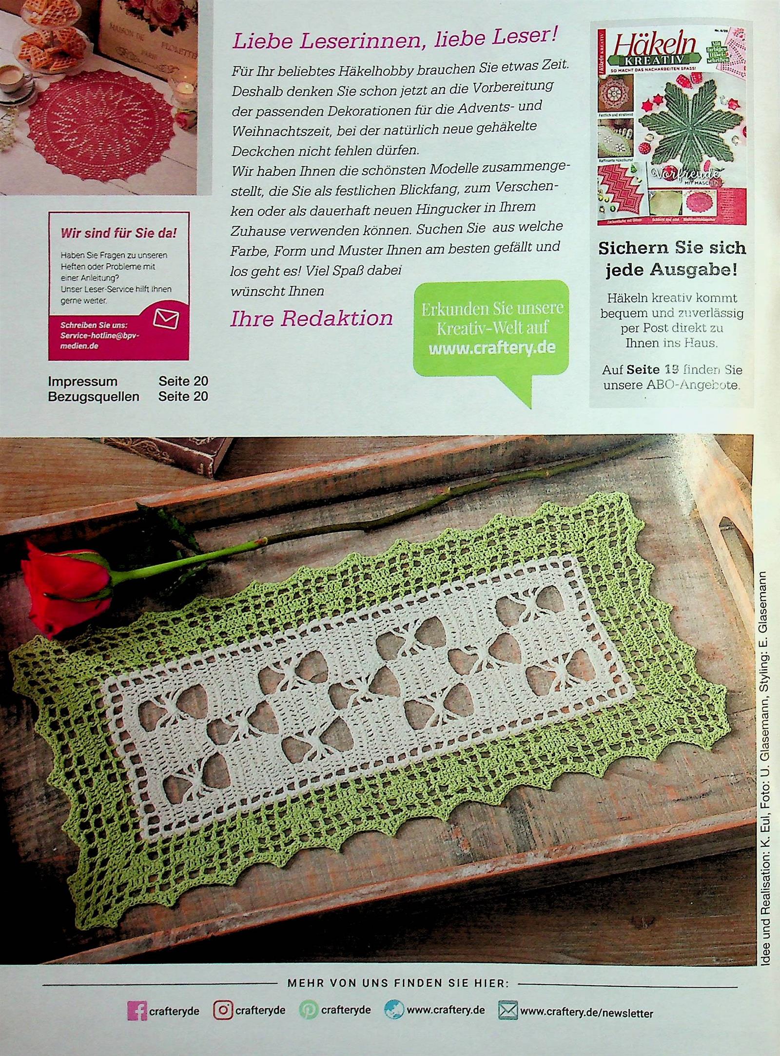 Häkeln kreativ fällt in die Kategorie der Handarbeitszeitschriften. Filethäkeln leicht gemacht bietet Trendideen zum Häkeln. Das Magazin Dekoratives Häkeln widmet sich den Deckchen und Läufern.