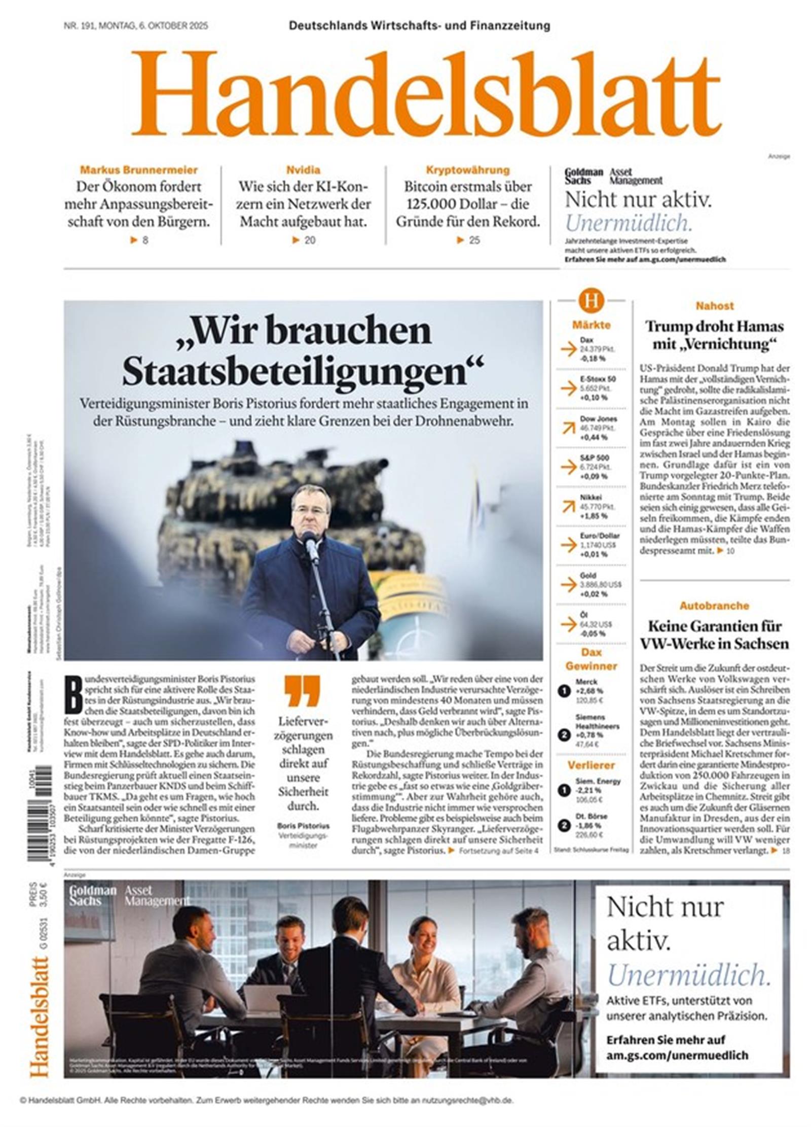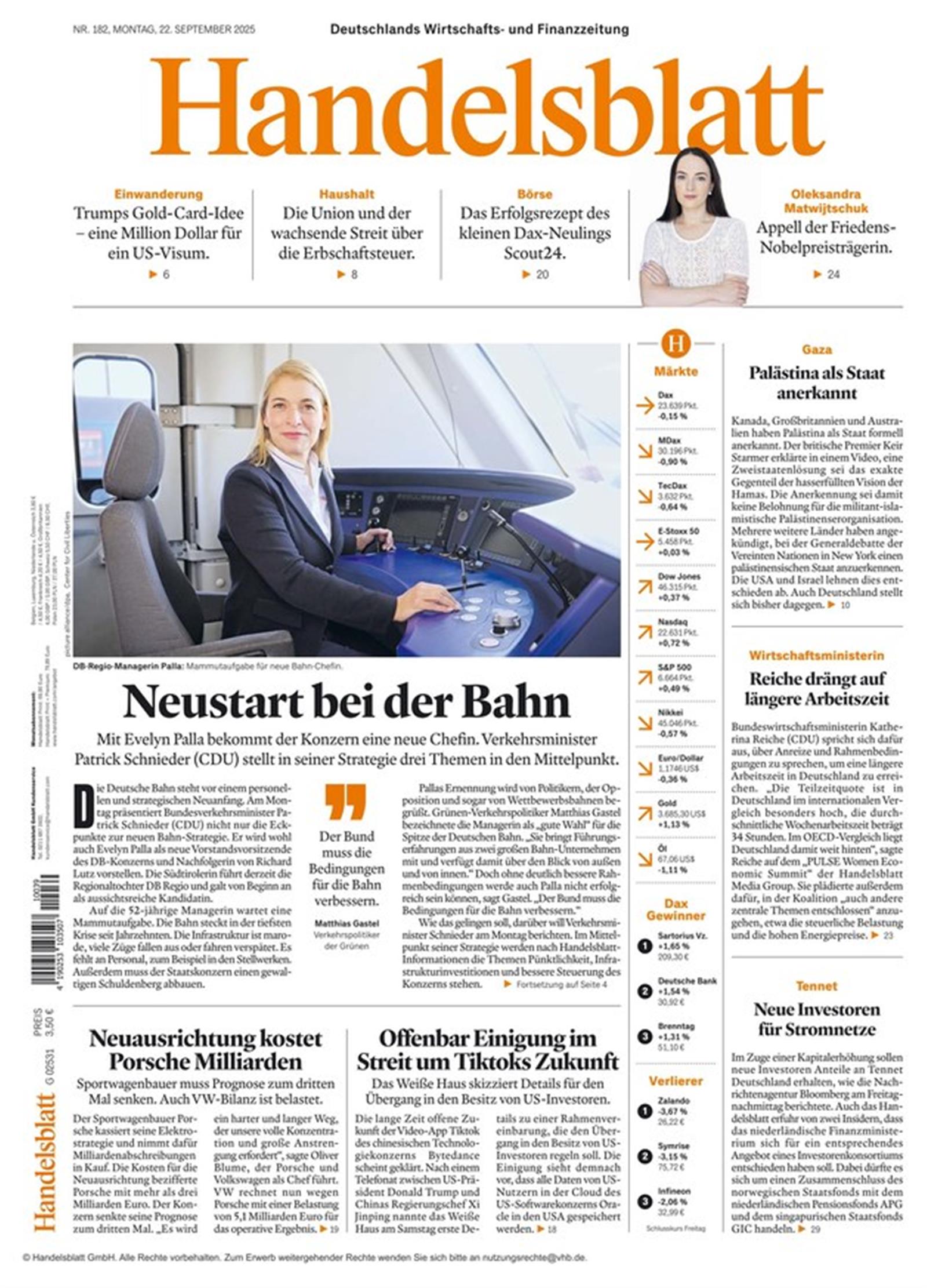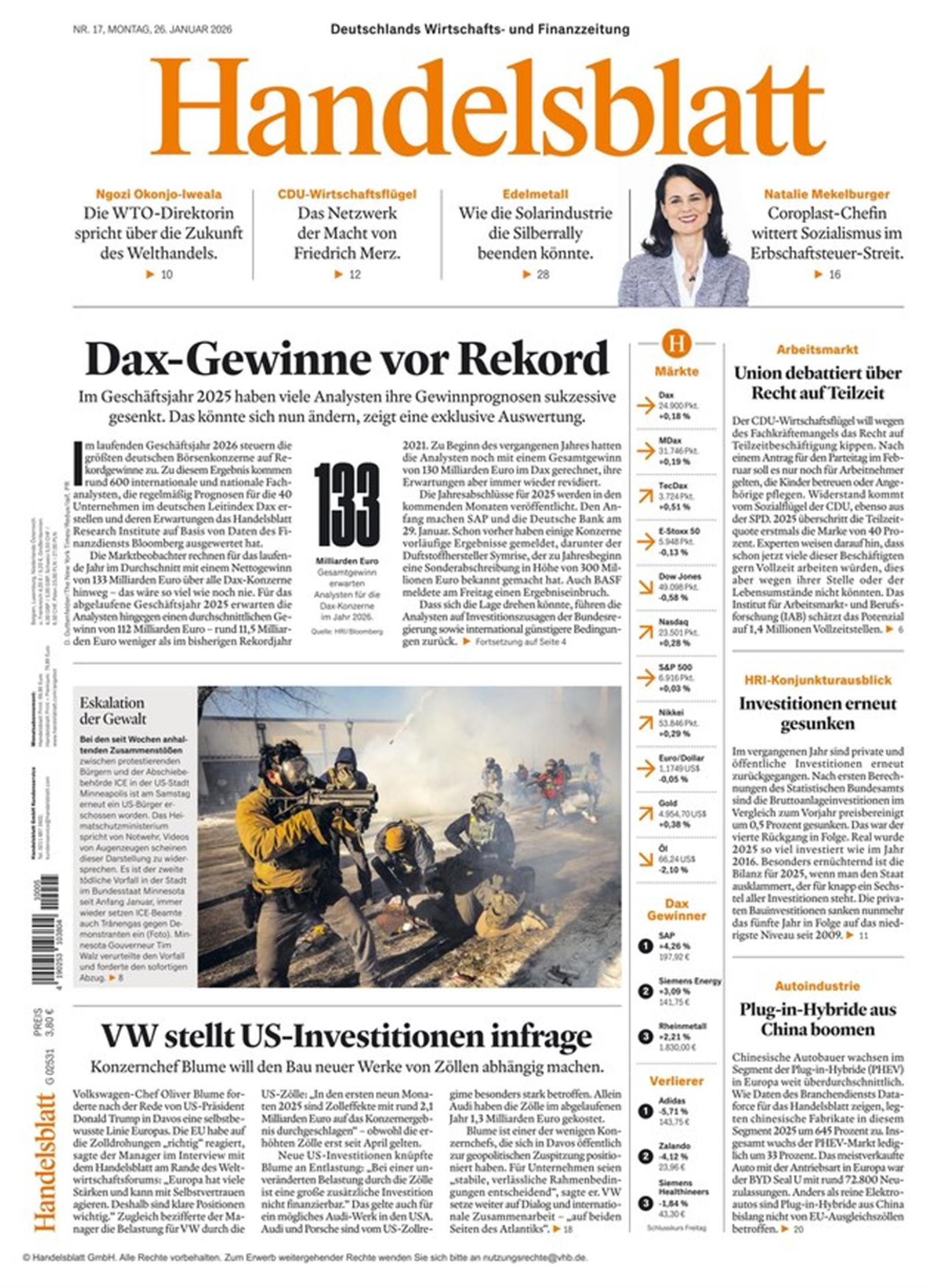 Das Handelsblatt ist die auflagenstärkste Wirtschafts- und Finanzzeitung in deutscher Sprache und ein Pflichtblatt der Wertpapierbörsen in Frankfurt und Düsseldorf. Wo Sie relevante Nachrichten zum Finanzgeschehen erhalten, aktuelle Informationen zu Kursbewegungen, Hintergründen, Investitionsmöglichkeiten bekommen, wenn nicht in einer börsennahen Tageszeitung? Folgen Sie klaren Analysen, lernen Sie von spannenden Interviewpartnern, prüfen Sie Ihre eigene Position in Konfrontation mit starken Meinungsbeiträgen! Unsere bekannten Ressorts wie Wirtschaft & Politik, Unternehmen & Märkte, Finanzen & Börse, Infografiken, Sport versorgen Sie tagesaktuell über Veränderungen und Neugründungen in Wirtschaft und Finanzen. Das Handelsblatt sorgt für fundierte Verbreitung von wirtschaftlichem Sachverstand.