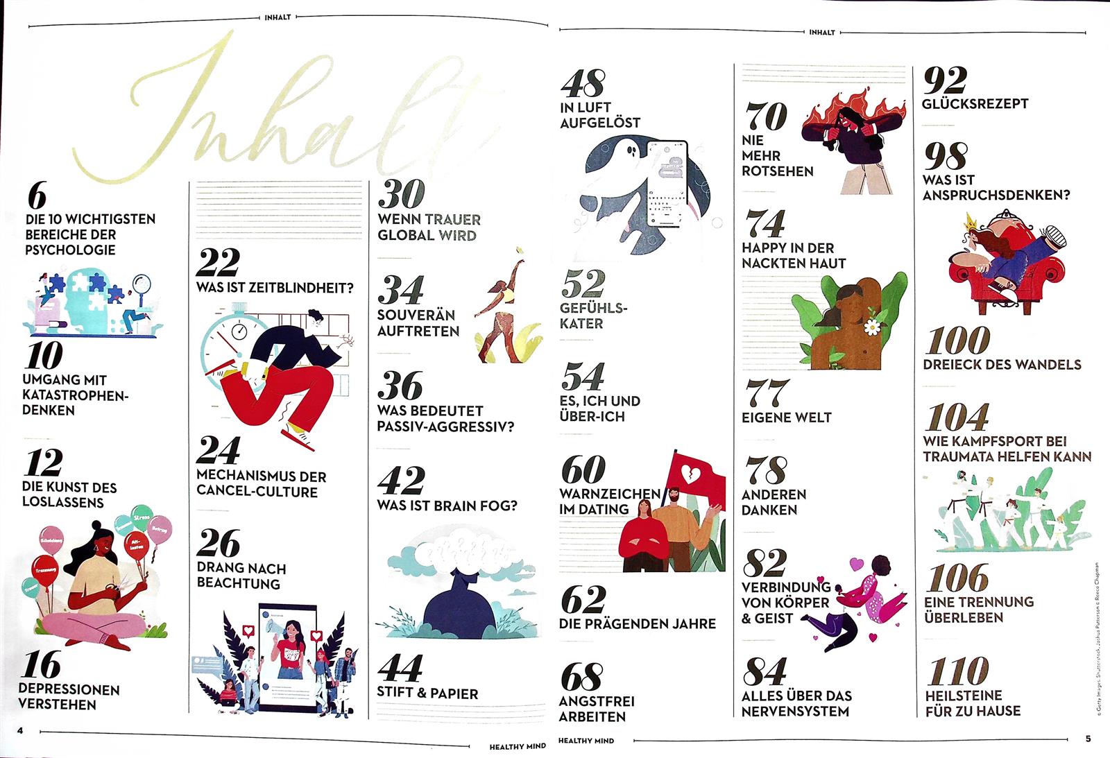 Die Zeitschrift Healthy Mind bietet eine Vielzahl von Inhalten, die sich auf das Wohlbefinden und die mentale Gesundheit konzentrieren. Leser finden Artikel über die neuesten Forschungsergebnisse zur Psychologie, Tipps zur Stressbewältigung und Strategien zur Förderung der emotionalen Intelligenz. Darüber hinaus werden auch Themen wie Achtsamkeit, Meditation und gesunde Lebensstile behandelt. Interviews mit Experten und Erfahrungsberichte von Betroffenen bieten wertvolle Einblicke und Inspiration. Die Zeitschrift ermutigt ihre Leser, ein gesundes Gleichgewicht zwischen Körper und Geist zu finden und gibt praktische Ratschläge zur Verbesserung der Lebensqualität. Mit abwechslungsreichen Inhalten ist sie eine wertvolle Ressource für alle, die ihr mentales Wohlbefinden stärken möchten.