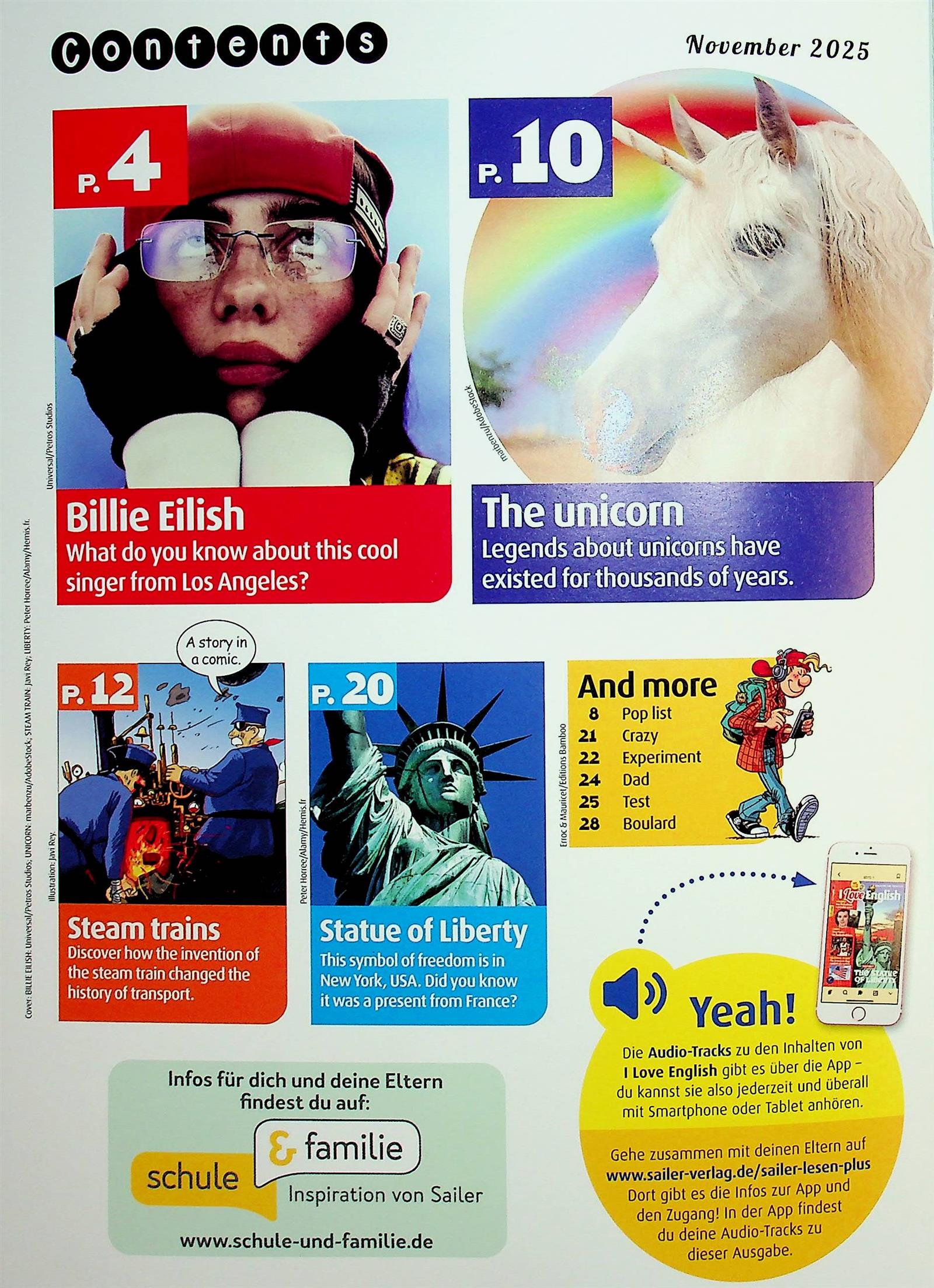 Billie Eilish war 14 Jahre alt, als sie auf eigene Faust einen Song veröffentlichte und viele Fans gewann. Heute, zehn Jahre später, ist sie ein Weltstar. I Love English fragt: Was weißt du über diese faszinierende Musikerin? Außerdem geht es nach New York zur Freiheitsstatue, zu Einhörnern und zurück in die Vergangenheit. Im Comic-Style wird die Geschichte der Dampfmaschine erzählt. Enjoy!