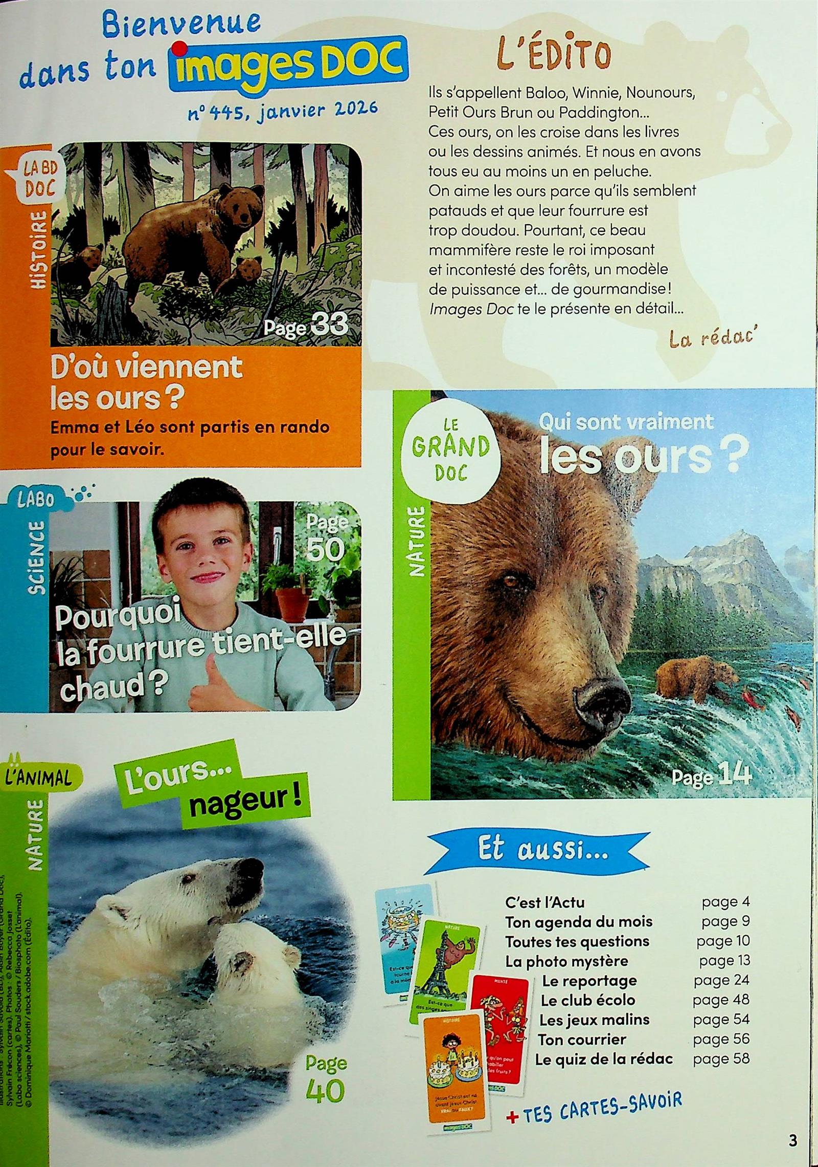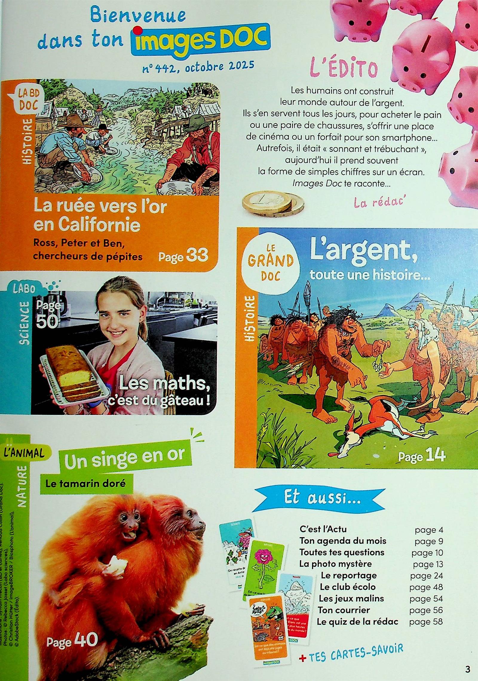 Wissenschaft, Natur, Geschichte… Das französische Dokuheft Images Doc richtet sich an neugierige Kinder von 8 bis 12 Jahren, zur privaten Lektüre bei vorhandenen muttersprachlichen Kenntnissen oder zur Verwendung in der Schule, zum Beispiel im Sprachunterricht. In jeder Ausgabe wird ein großes Thema schwerpunktmäßig behandelt, ein besonderes, geschichtliches Ereignis in Comic-Form dargestellt, ein Tier und seine Lebensgewohnheiten in einer Foto-Doku präsentiert, und verschiedene Wissenschaftsexperimente zum Nachmachen empfohlen. Zudem bringt jede Ausgabe eine schöne Überraschung: Poster, Pläne zum Aufklappen, Beihefter zum Mitnehmen…