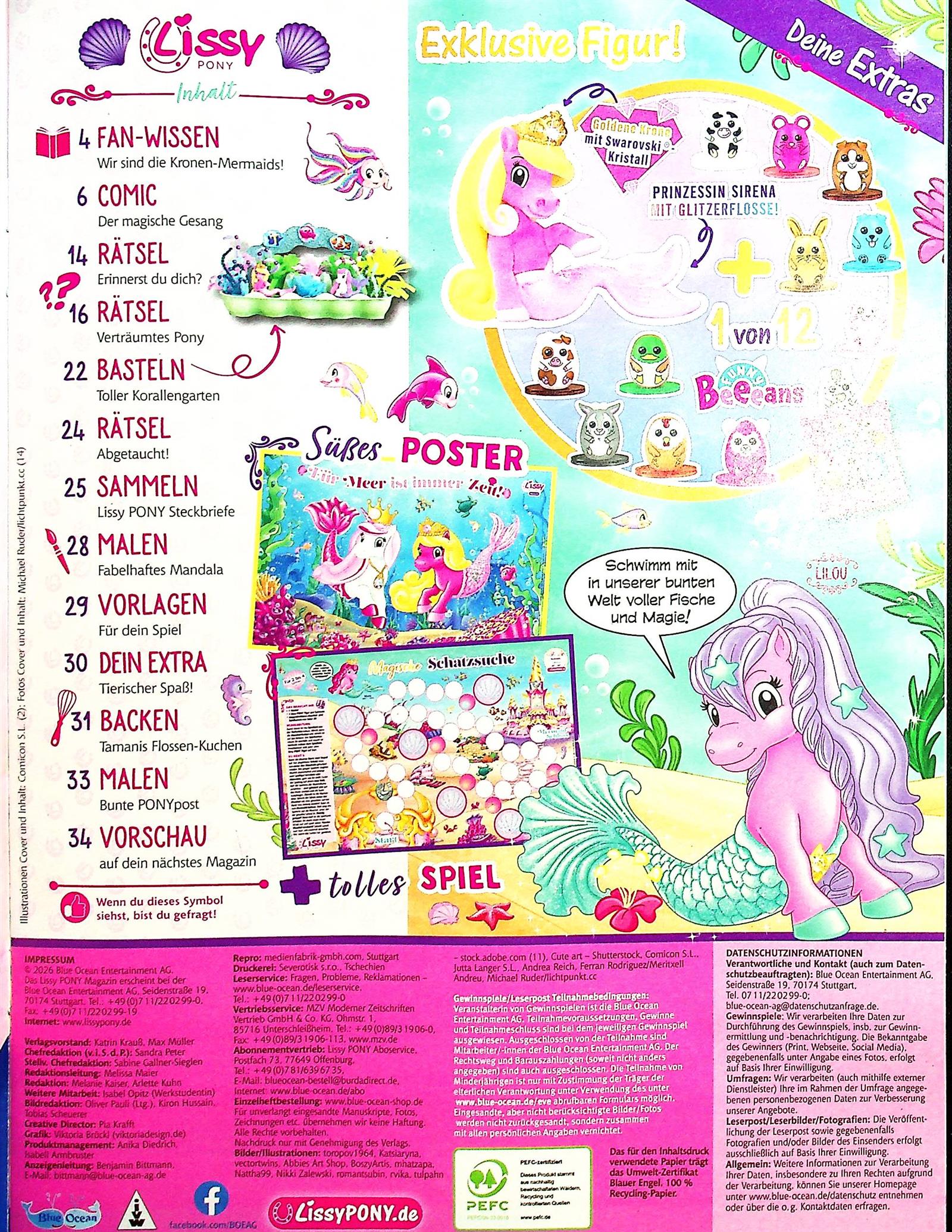 Willkommen in der funkelnden Unterwasserwelt von Lissy Pony: Entdecke zauberhafte Mermaids, sammle eine von 18 Figuren und begleite Girofle im Comic auf Perlensuche. Bastle dein eigenes Tierheim, backe „Pearlas“ Muschelkekse und erfahre spannendes Fan-Wissen. Magische Abenteuer, Kreativspaß und Meeresglanz warten auf dich.