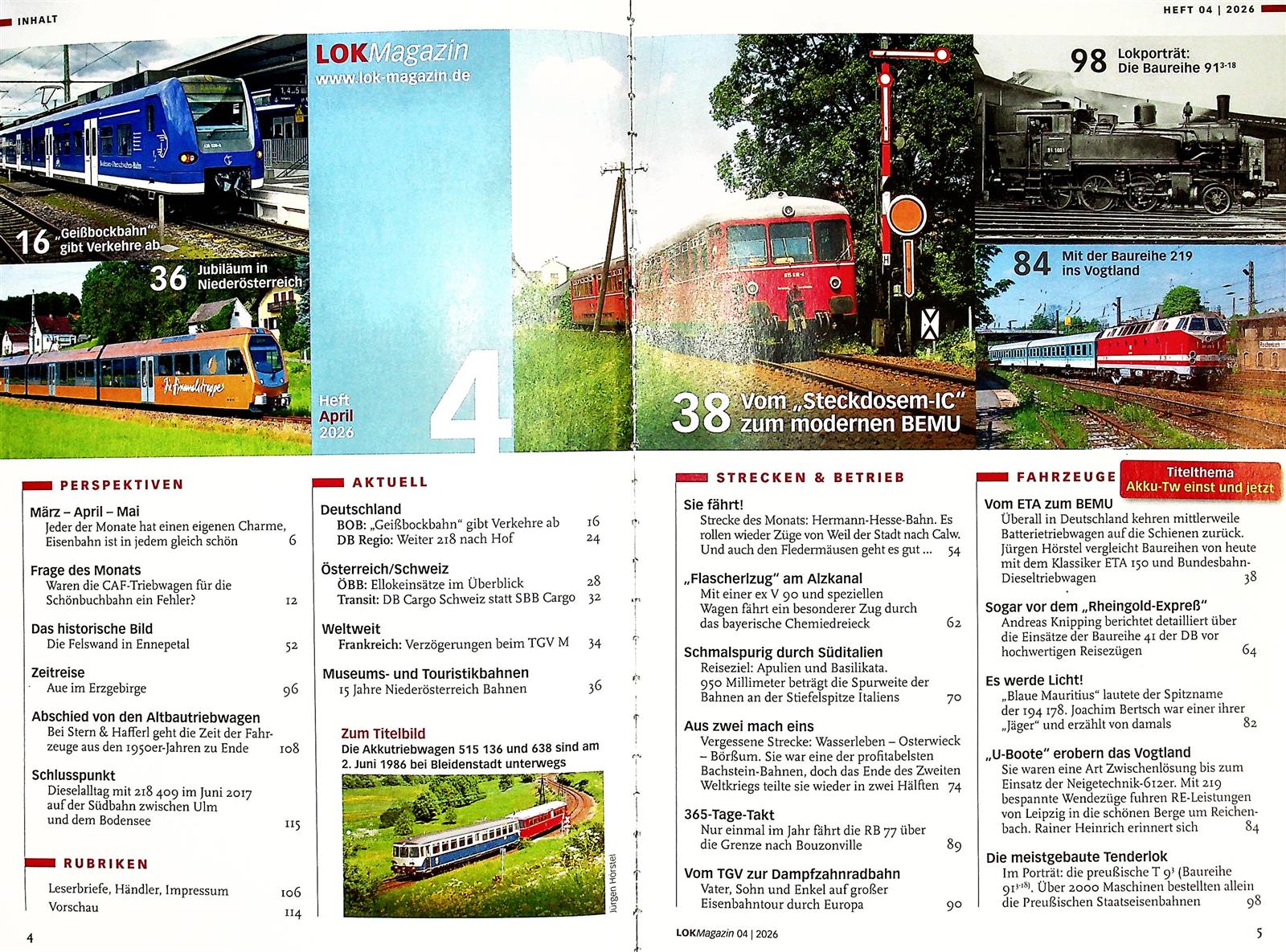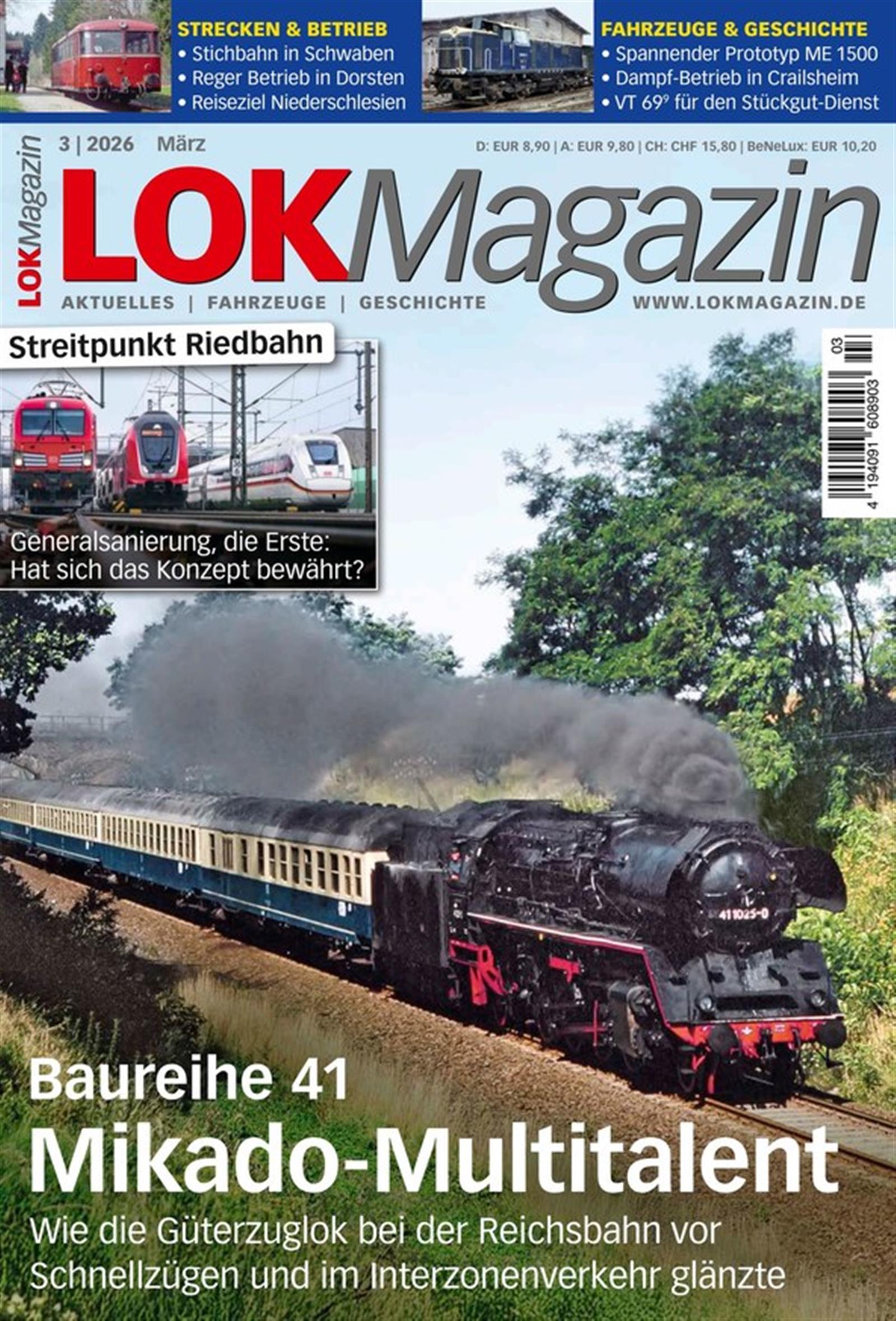 LOK Magazin stellt neue Baureihen und sehenswerte Bahnstrecken vor, informiert über neue Entwicklungen im Schienenverkehr und beleuchtet in bebilderten Reportagen das aktuelle Bahngeschehen in Deutschland, Österreich und der Schweiz. Anekdoten und Erlebnisberichte erinnern an die Vergangenheit der Eisenbahn und runden das Magazin ab.