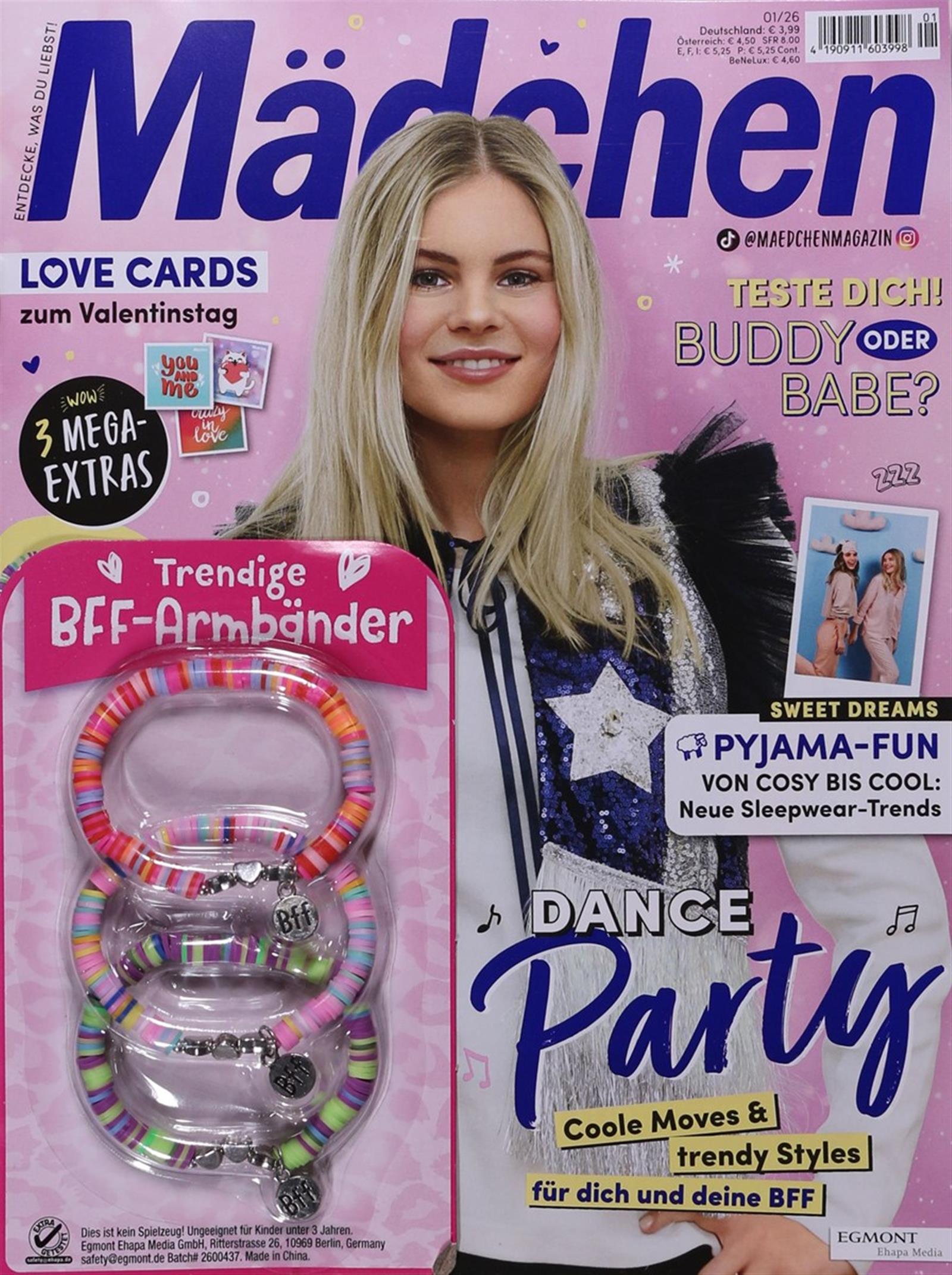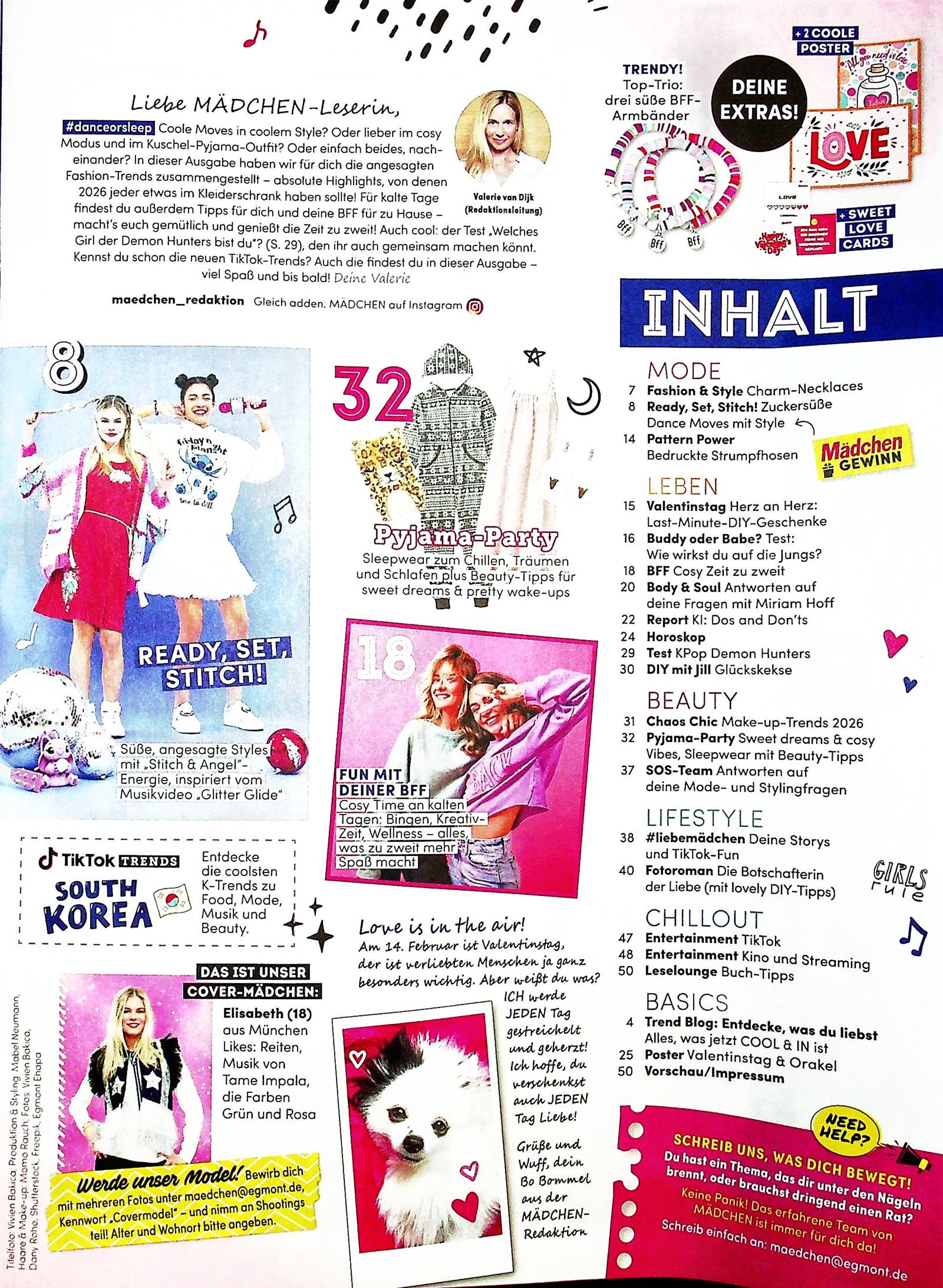 Dieses Heft steckt voller Trends und Feelgood-Vibes: angesagte Mode- und Beauty-Looks, Dance-Moves, TikTok-Trends und kreative DIY-Ideen. Dazu Tests, Horoskop, BFF-Zeit, Pyjama-Party-Inspiration und Liebe zum Valentinstag. Lifestyle, Spaß und Styling-Tipps treffen auf cosy Chillout-Momente – perfekt zum Mitmachen, Träumen und Teilen.