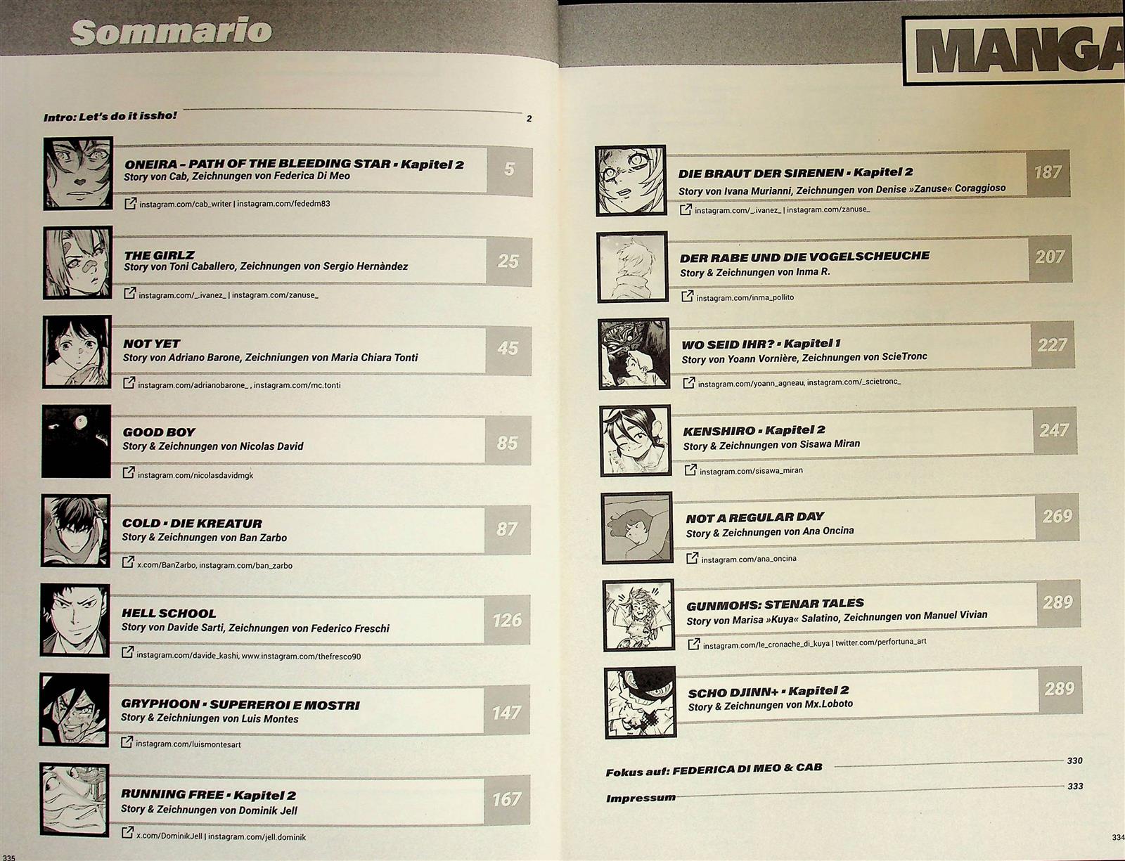 MANGA ISSHO erscheint zeitgleich in vier Sprachen und präsentiert Serien und Kurzgeschichten von Autor*innen aus den beteiligten vier Sprachräumen. Auf jeweils 336 Seiten bietet das Magazin einen einzigartigen Mix aus Genres und Stilrichtungen, der sich als das Who's Who der europäoschen Manga-Szene sammeln lässt.