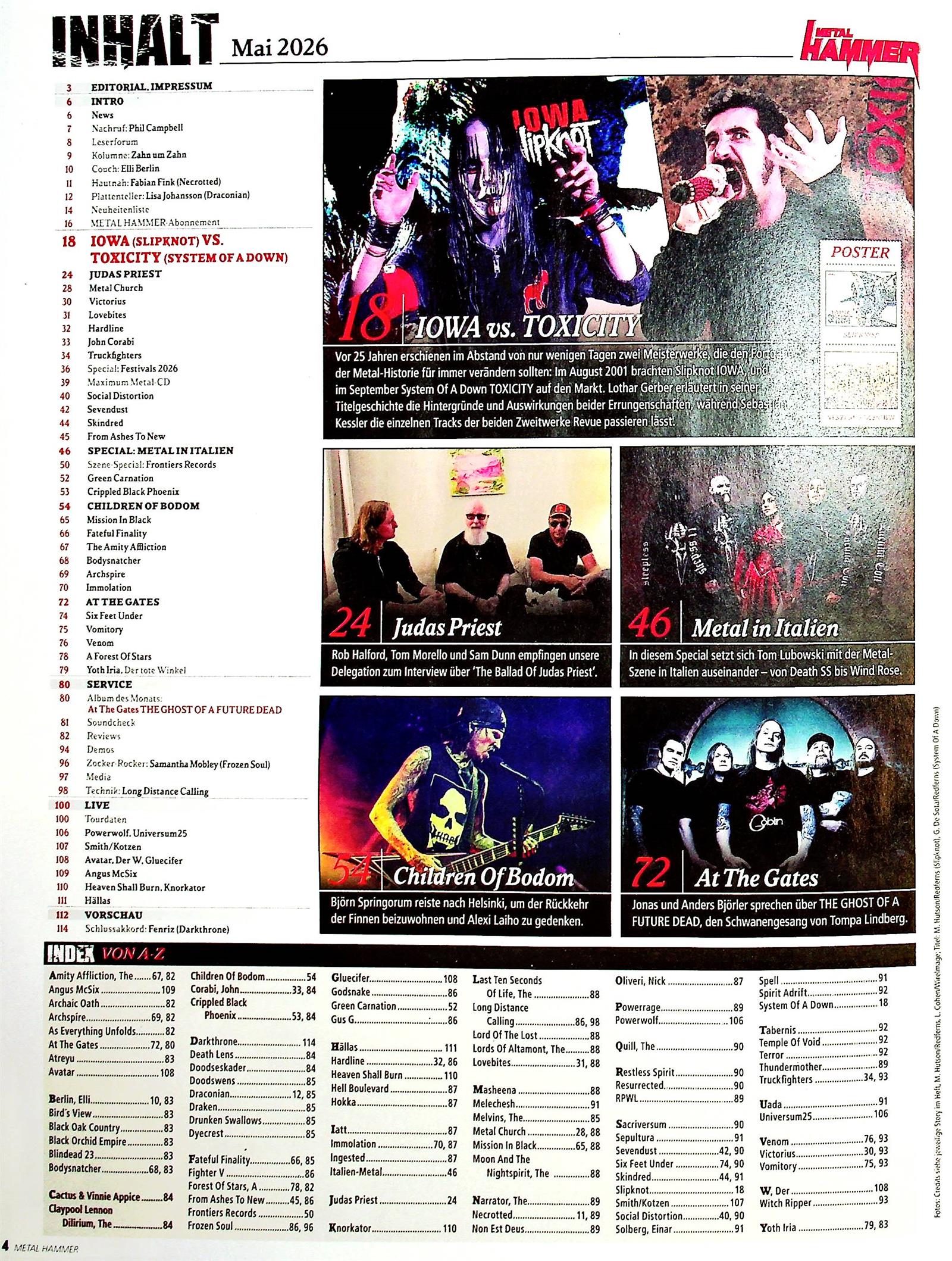 Vor 25 Jahren erschienen im Abstand von nur wenigen Tagen zwei Meisterwerke, die den Fortgang der Metal-Historie für immer verändern sollten: Im August 2001 brachten Slipknot Iowa und im September System of a Down Toxicity auf den Markt. Lothar Gerber erläutert in seiner Titelgeschichte die Hintergründe und Auswirkungen beider Errungenschaften, während Sebastian Kessler die einzelnen Tracks der beiden Zweitwerke Revue passieren lässt.