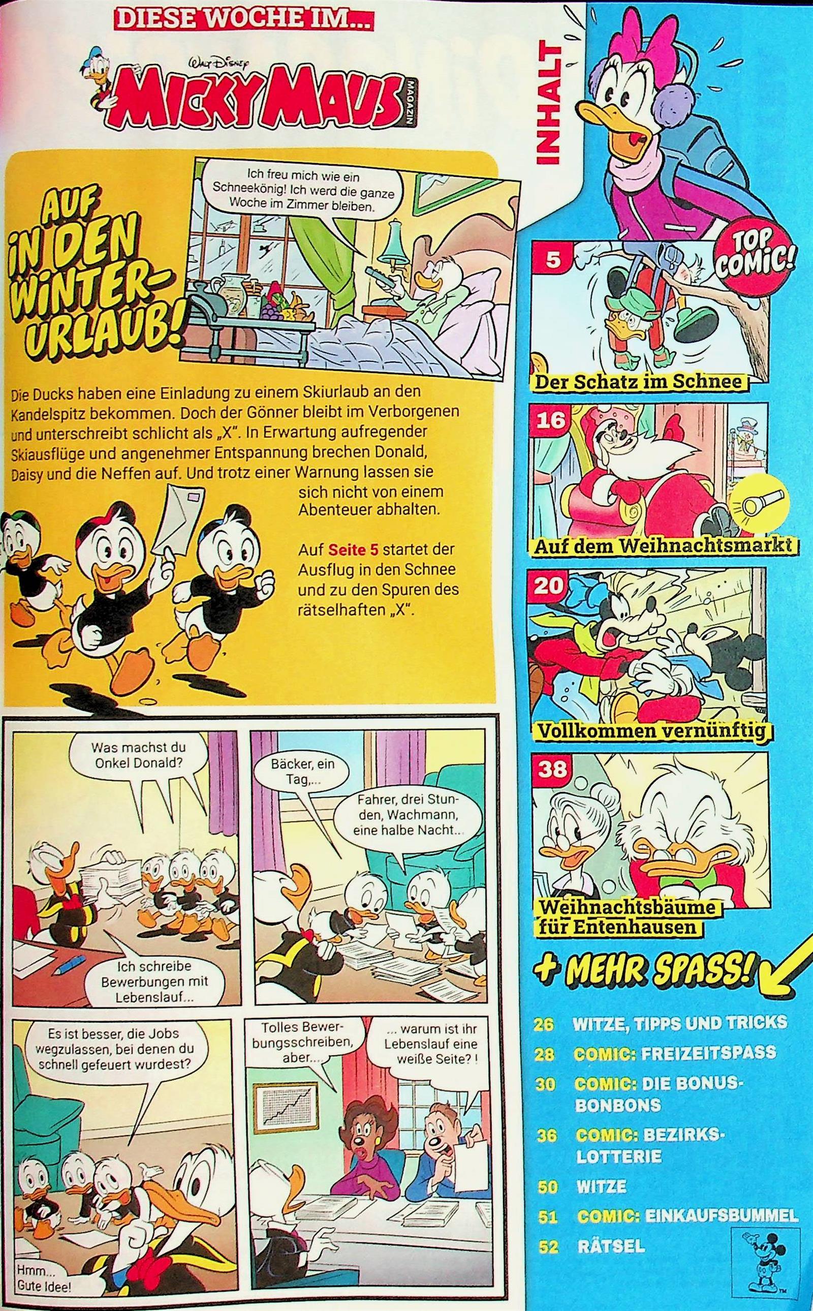 Micky Maus ist nicht nur Comic, immer wieder lässt sich die Redaktion Neues einfallen, bringt Extras in die Zeitschrift, und macht sie damit zu einem sehr beliebten und doch immer frisch wirkenden Klassiker unter den Kinderzeitschriften. Spaß steht im Vordergrund, der spannenden wie vielfältigen Inhalte. Die brandneuen lustigen Comicgeschichten aus Entenhausen werden kombiniert mit Tipps und Tricks, kniffligen Rätselcomics. So werden die jungen Leser motiviert selbst aktiv zu werden und spannende Fälle in Entenhausen zu lösen.