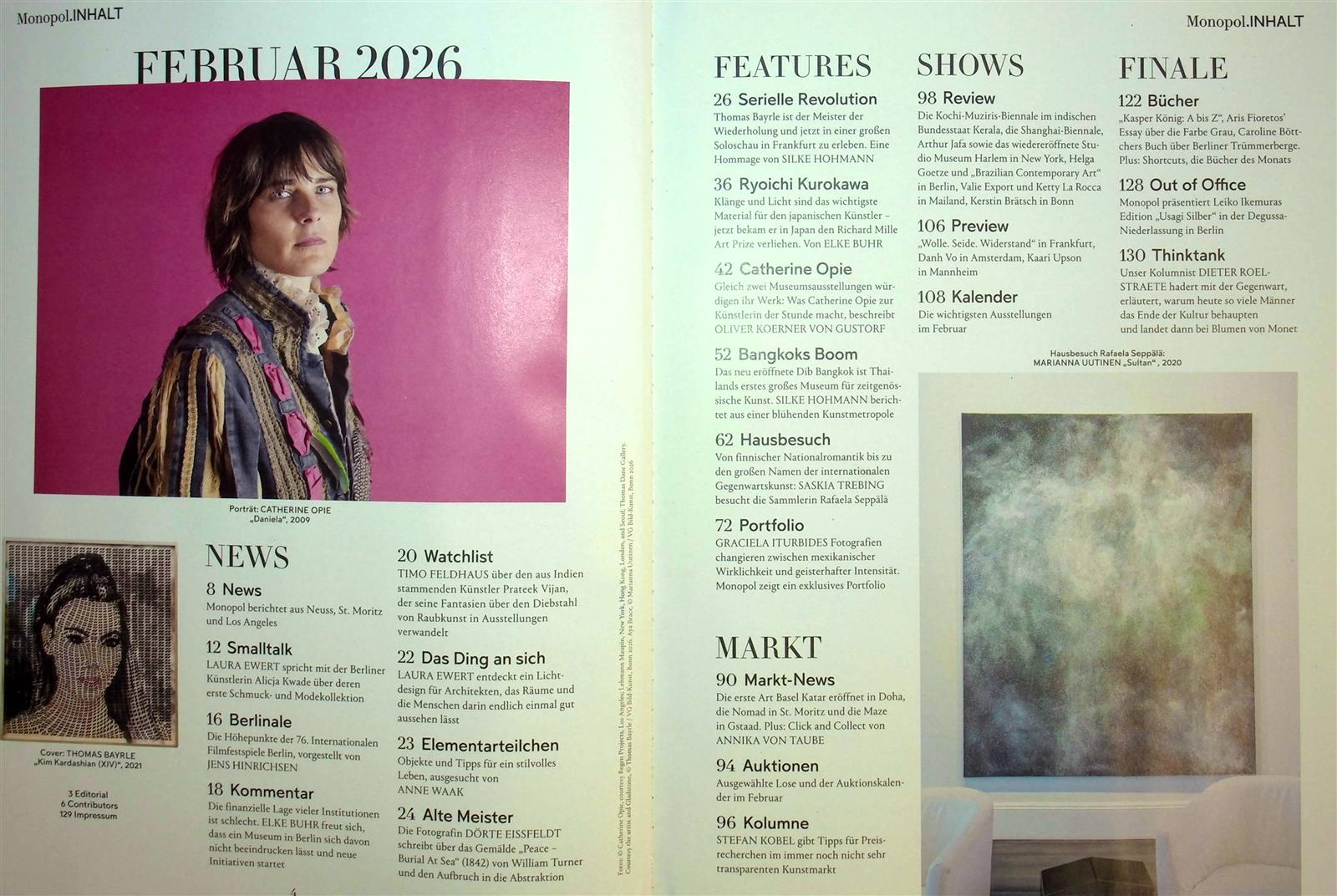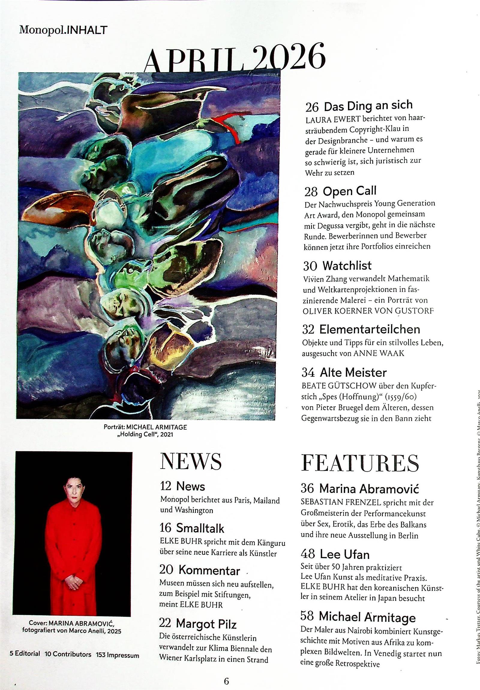 monopol ist ein Magazin für zeitgenössische Kunst, das nebenbei Architektur, Mode, Design und Popkultur in den Blick nimmt. Anders als andere Kunstmagazine hat monopol eine dezidierte journalistische Herangehensweise an die Kunst: Das Magazin soll kein Heft für Insider sein, es will sich der Diversität der Kunstszene stellen, die immer internationaler wird. Demnach werden neben bekannten auch neue Gesichter in diesem Magazin auftauchen, die diese internationale und diverse Kunstszene abbilden.