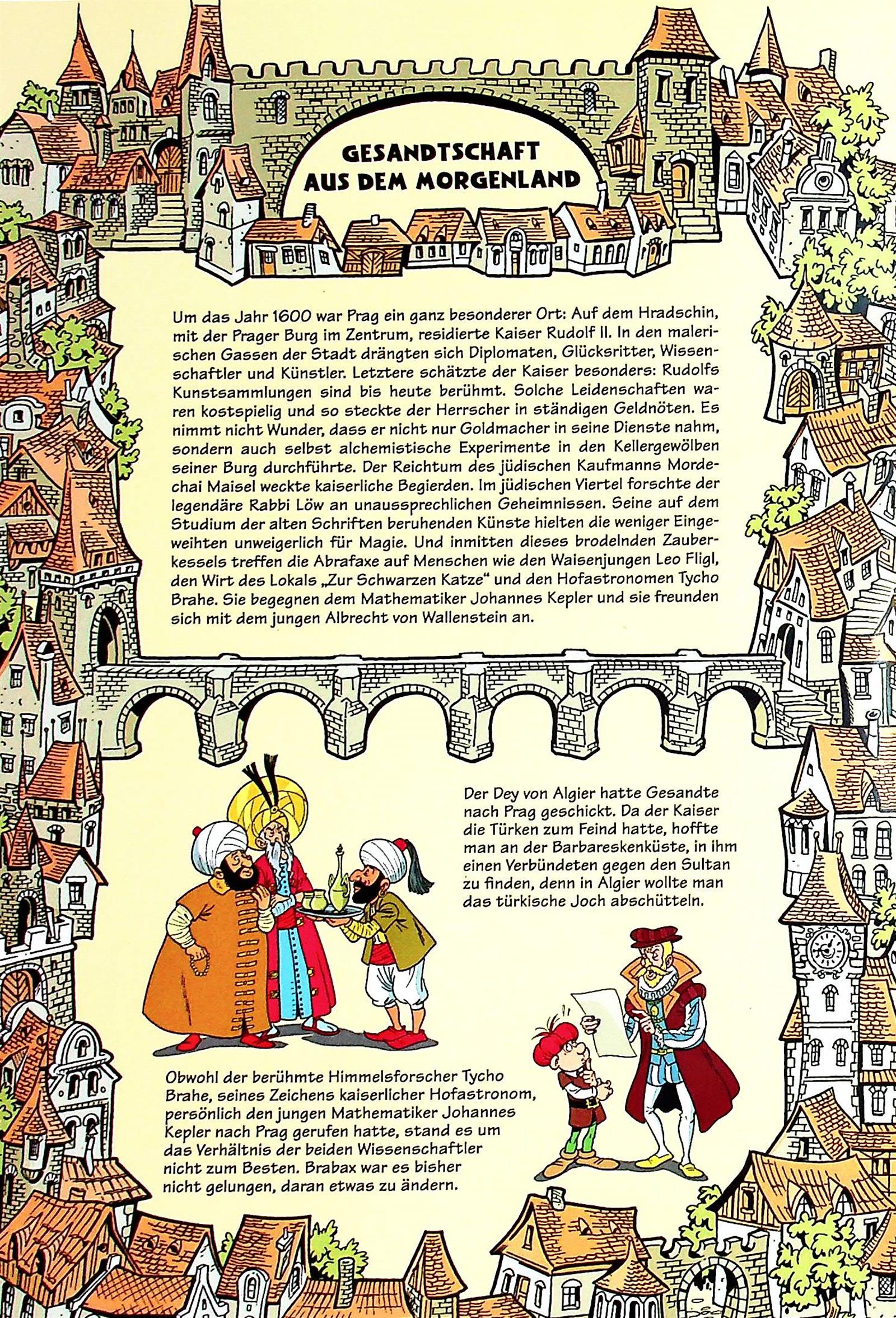Im Prag Kaiser Rudolfs II. begegnen die Abrafaxe Diplomat:innen, Wissenschaftler:innen und Künstler:innen. Im jüdischen Viertel arbeitet Rabbi Löw an rätselhaften Geheimnissen, die wie Magie wirken. In diesem lebhaften Umfeld treffen die Abrafaxe Leo Fligl, den Wirt der „Schwarzen Katze“, Tycho Brahe, Johannes Kepler und den jungen Albrecht von Wallenstein.