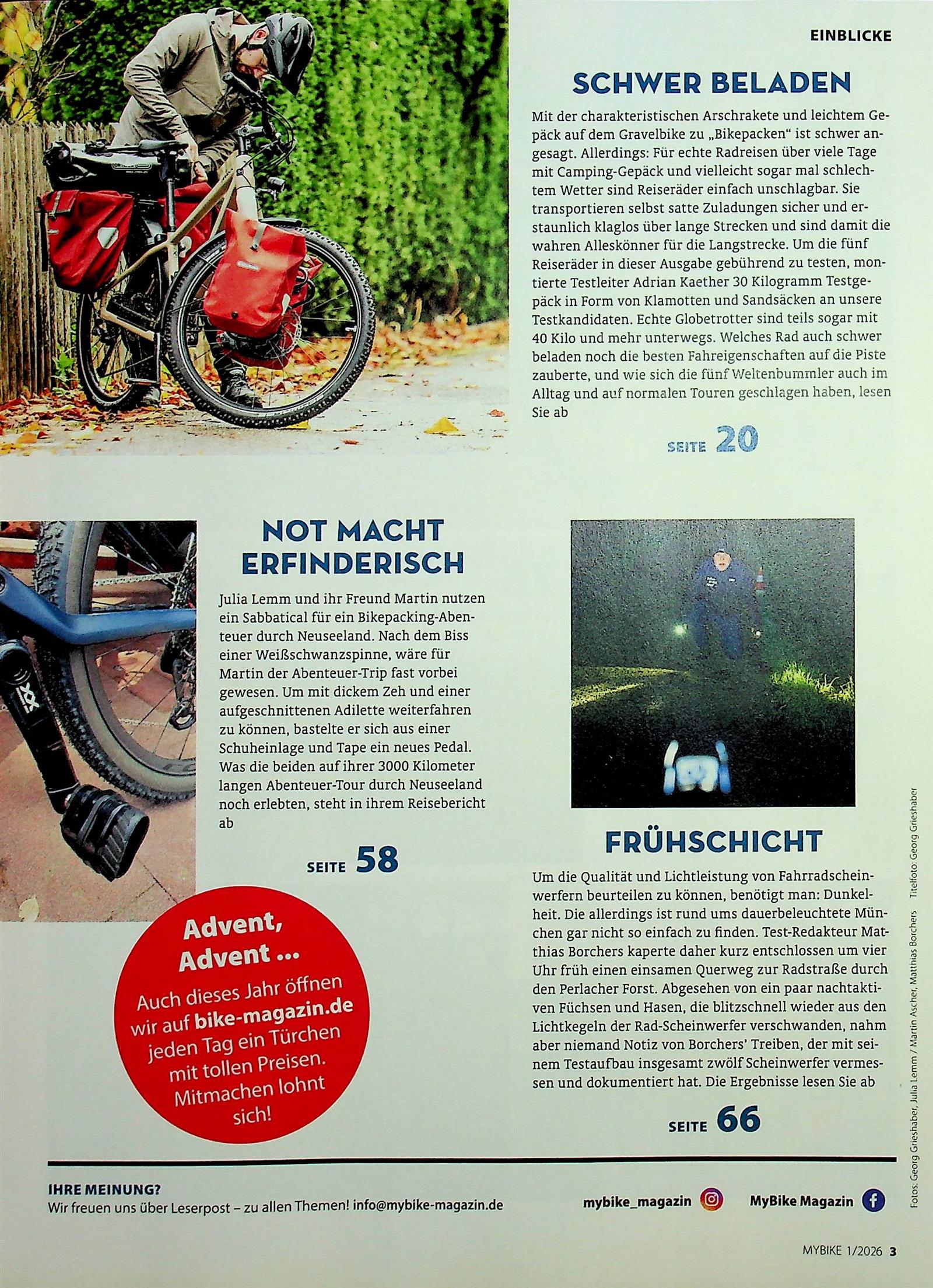 Ganz nette Reisereportagen, aber manches Mal mit geringem Informationsgehalt. So fehlen teilweise Höhenangaben und\oder Kartenübersichten. Bei Ausstattungsberichten fehlt auch schon mal die Preisangabe oder auch Radtests ohne Angabe des maximal zulässigen Gesamtgewichts der Testräder. Das ist zwar u.a. Aufgrund vieler Photos leicht zu konsumieren aber inhaltlich recht oberflächlich bzw. bisweilen auch trivial (Bspl. MyBike 5/23 - Test zu Radreinigern “Die schlanke Flasche liegt gut in der Hand….” =)))), weshalb ich mein Kurzabo nicht verlängere und mich nach anderen Magazinen umsehen werde.