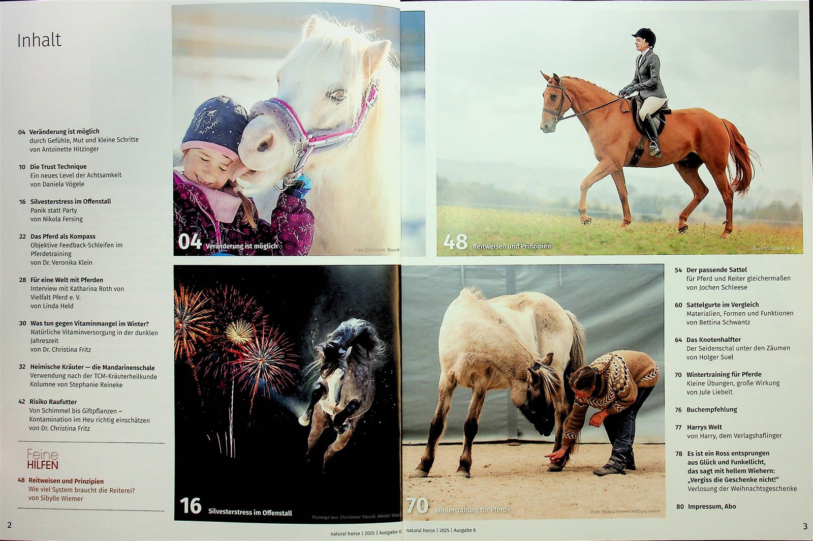 Sehr hochwertiges Magazin mit Fachartikeln zu pferdegerechter Haltung, pferdegerechtem Training, Pferd-Mensch-Beziehung, Pferdegesundheit und Pferdeverhalten. Man kauft ein Magazin, das fachlich top ist und auch wunderschön ist. Die Fotos unterstreichen die Artikeln. Man merkt, dass Pferdefachleute gerne ihr Wissen weitergeben und dass diejenigen, die das Magazin machen, Wert auf gute Qualität legen. Bei manchen Artikeln, vor allem bei den Trainingsartikeln sind QR-Codes für Smartphones dabei. Da kann man sich Videoclips ansehen. Für mich das beste Pferdemagazin derzeit am Markt: informativ und zum Wohl des Pferdes