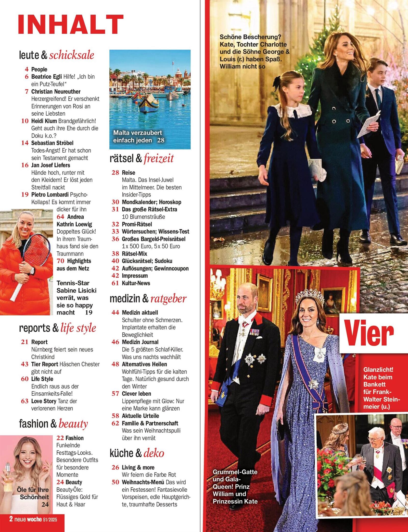 Für den bunten und informativen Mix stehen auch die weiteren Schwerpunkte des Magazins. Ein großer Service- und Ratgeberteil hält eine Vielzahl von Tipps bereit. Top-aktuelle Fashion-Trends, die angesagten Beauty-Styles, Living- und Foodthemen mit der Neuen Woche bleiben Sie auch in diesen Bereichen immer bestens informiert. Mit Tipps zu Geld- und Rechtsfragen, fundierten Informationen zu Gesundheitstrends und Ratschlägen in Sachen Partnerschaft wird die überaus umfassende Themenauswahl abgerundet.