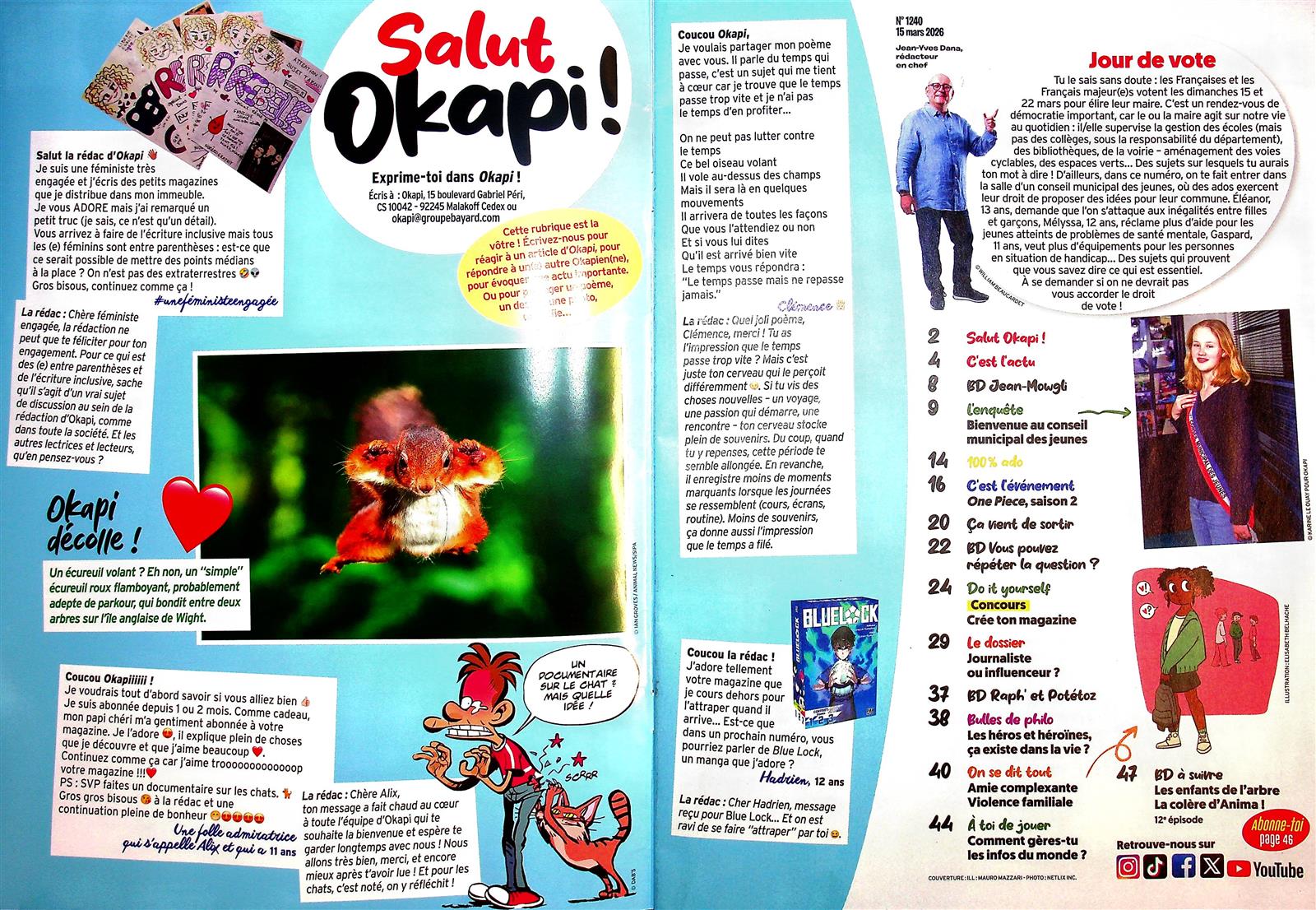 Cette édition d’Okapi met en avant les stars préférées des lecteur·rice·s à travers un sondage exclusif, dont Kylian Mbappé et Louane. Des portraits personnels offrent des regards sincères sur la célébrité et la vie quotidienne. Le magazine aborde aussi le harcèlement scolaire, les liens familiaux et la question du bonheur, complétés par des rubriques de savoir et des sujets de société vus par les jeunes.