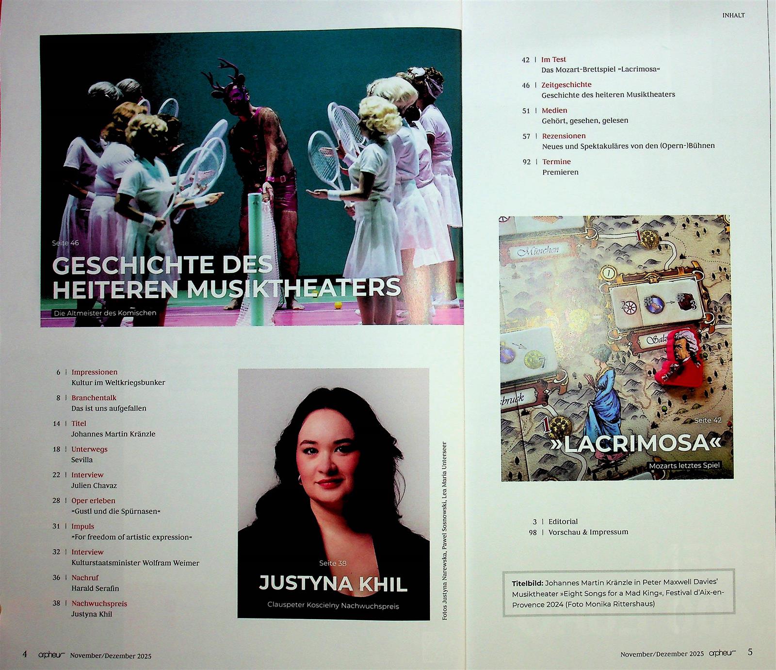 Orpheus finden Sie in der Kategorie Kultur- und Musikzeitschriften. in diesem Segment bieten sich noch zwei weitere ausgewiesene Opernmagazine an, die sowohl die nationale, als auch die internationale Opernszene unter die Lupe nehmen: die Opernwelt und das Opernglas. Das Blatt der Theaterbranche heißt Theater Heute. Interessant erscheint auch die Neue Zeitschrift für Musik, die als Leitmedium für zeitgenössische Musik steht.