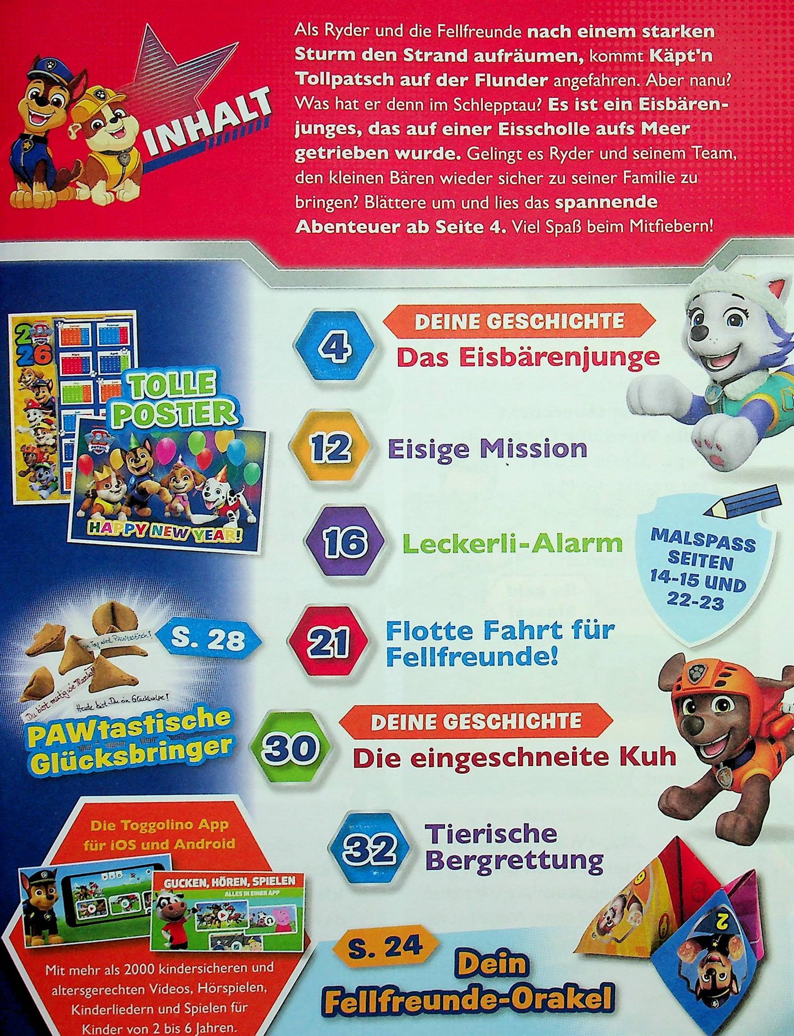 Als Ryder und die Fellfreunde nach einem starken Sturm den Strand aufräumen, kommt Käpt'n Tollpatsch auf der Flunder angefahren. Aber nanu? Was hat er denn im Schlepptau? Es ist ein Eisbärenjunges, das auf einer Eisscholle aufs Meer getrieben wurde. Gelingt es Ryder und seinem Team, den kleinen Baren wieder sicher zu seiner Familie zu bringen? Blättere um und lies das spannende Abenteuer in dieser Ausgabe.